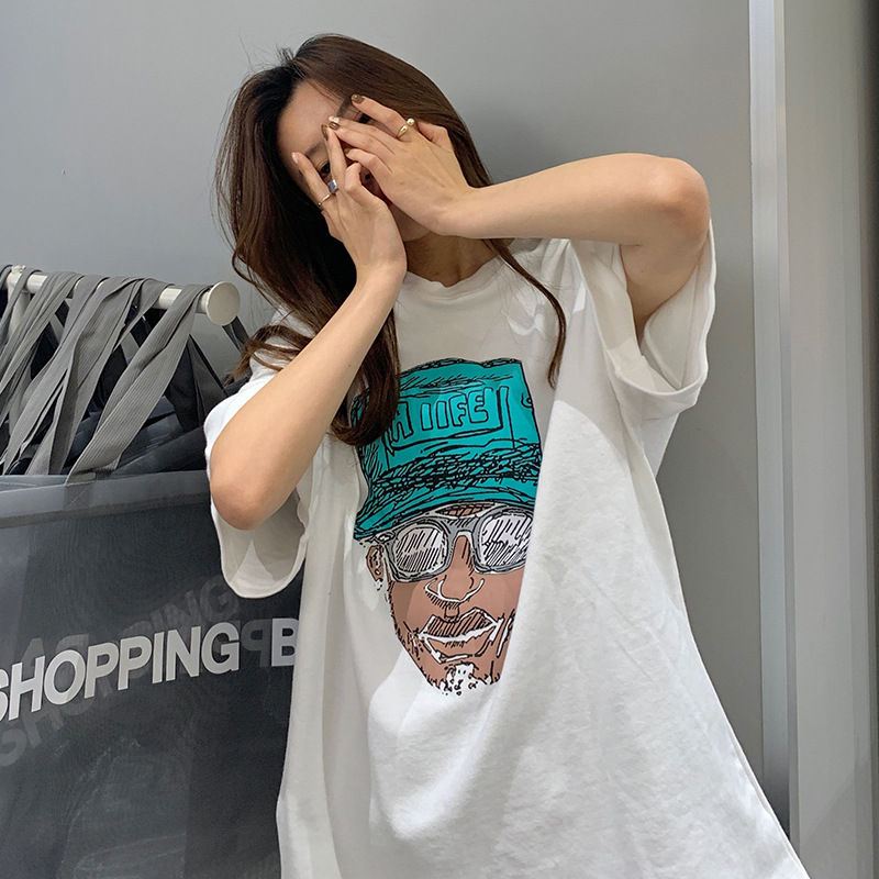 韩版宽松短袖T恤女夏季新款卡通印花中长款圆领正肩百搭上衣