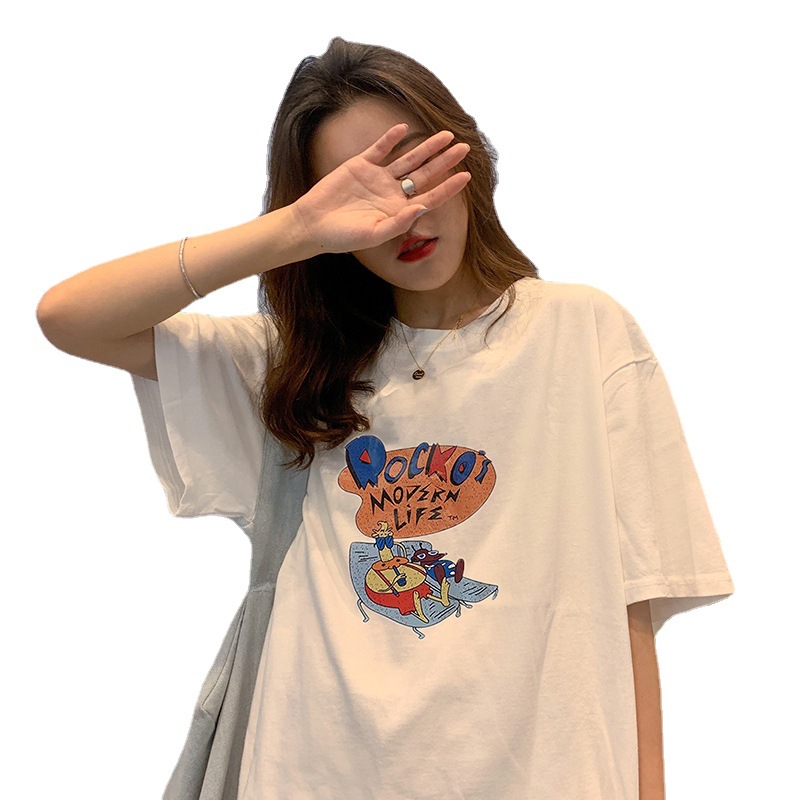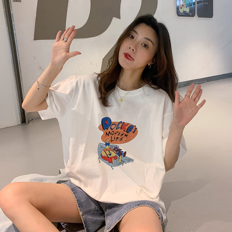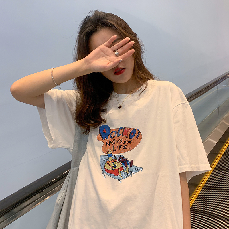 ins风白色短袖T恤女装夏季新款韩版卡通印花纯棉宽松百搭上衣
