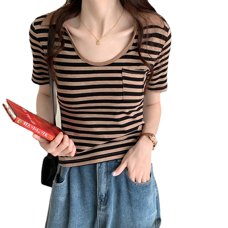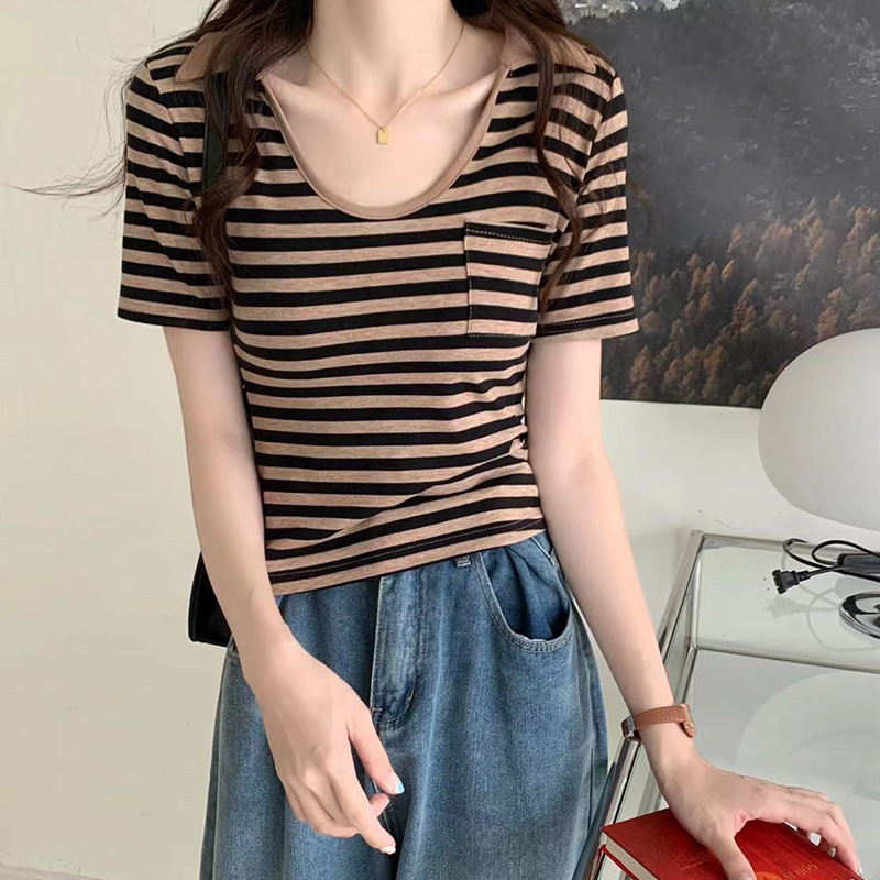 甜辣妹纯欲风高腰条纹T恤U字领内搭打底衫辣妹短款修身显瘦上衣夏