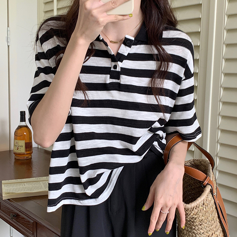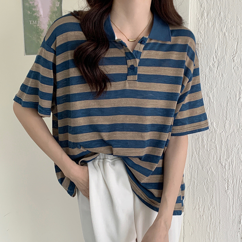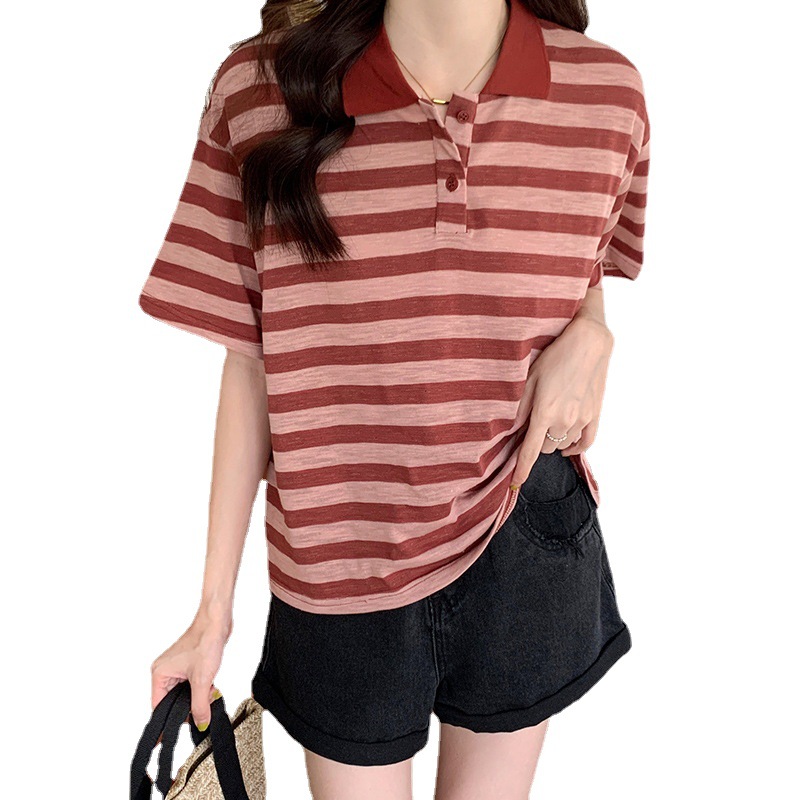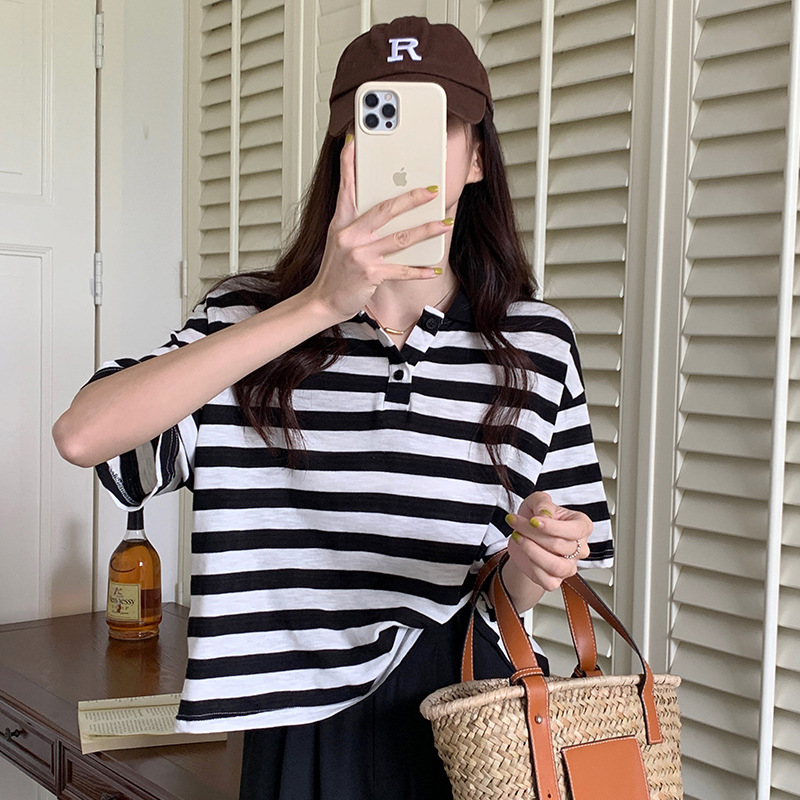 纯棉条纹短袖T恤夏季新款撞色POLO领宽松藏肉显瘦减龄上衣ins