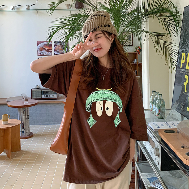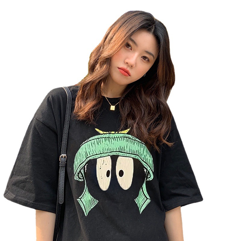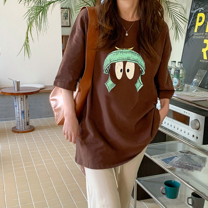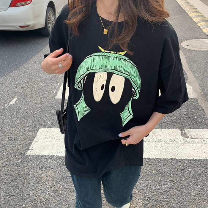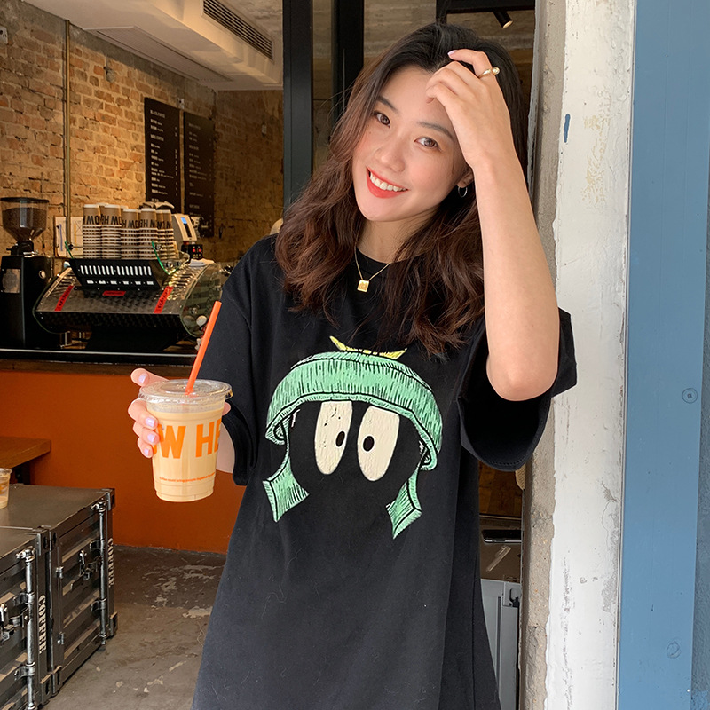 夏季正肩圆领纯棉短袖T恤女卡通印花美式高街潮流中长款上衣