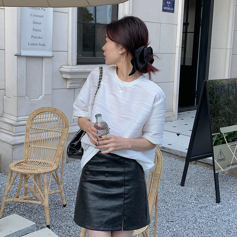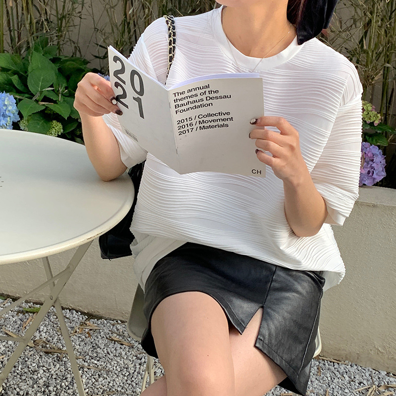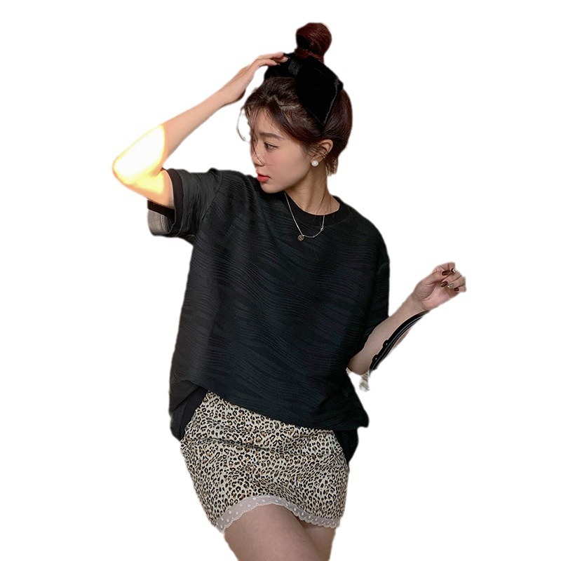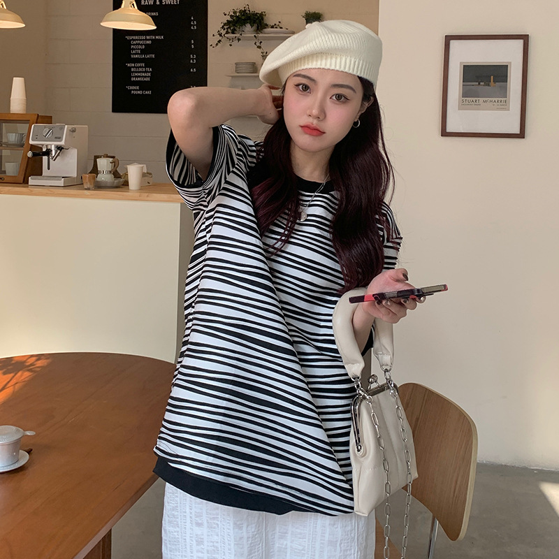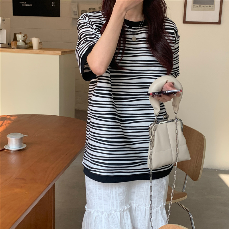 高级感肌理感条纹短袖T恤女春夏宽松休闲打底衫小众正肩圆领上衣