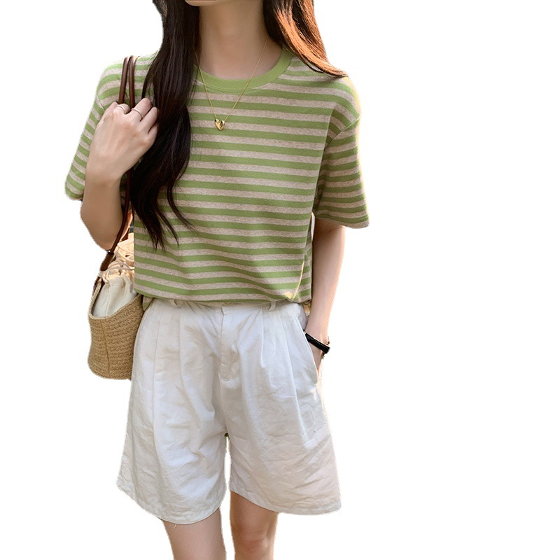 复古港风条纹短袖T恤女夏季新款撞色正肩高级感小众别致上衣