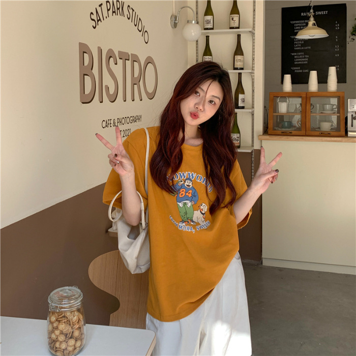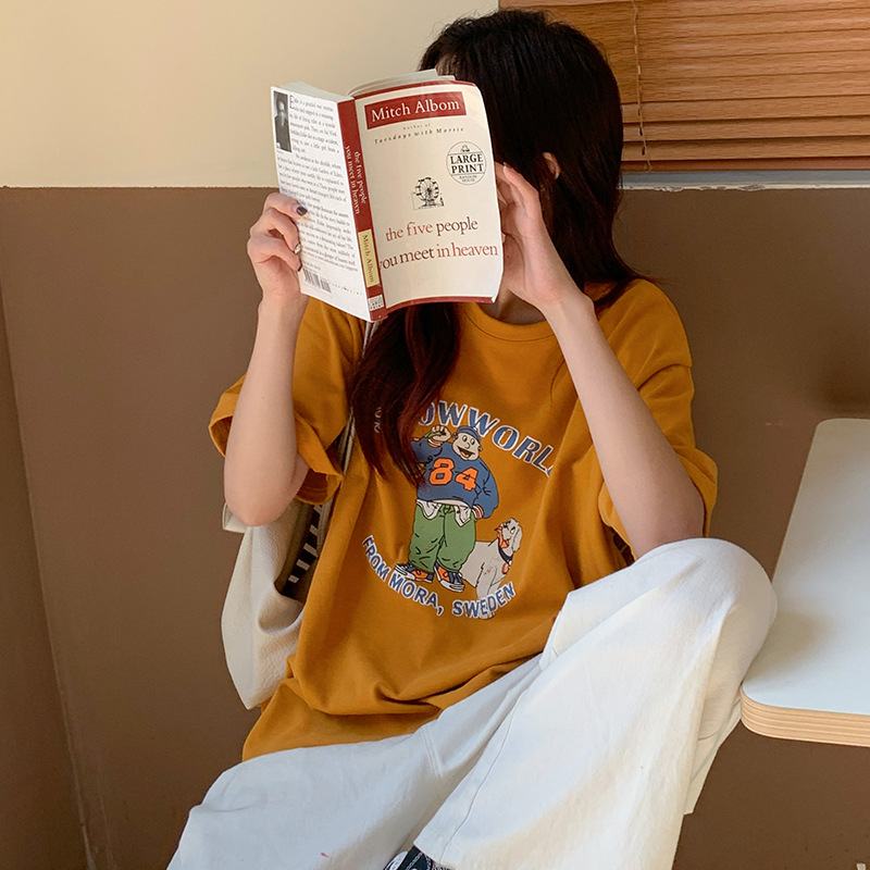 宽松慵懒风圆领纯棉短袖T恤女夏季新款卡通印花显瘦百搭上衣