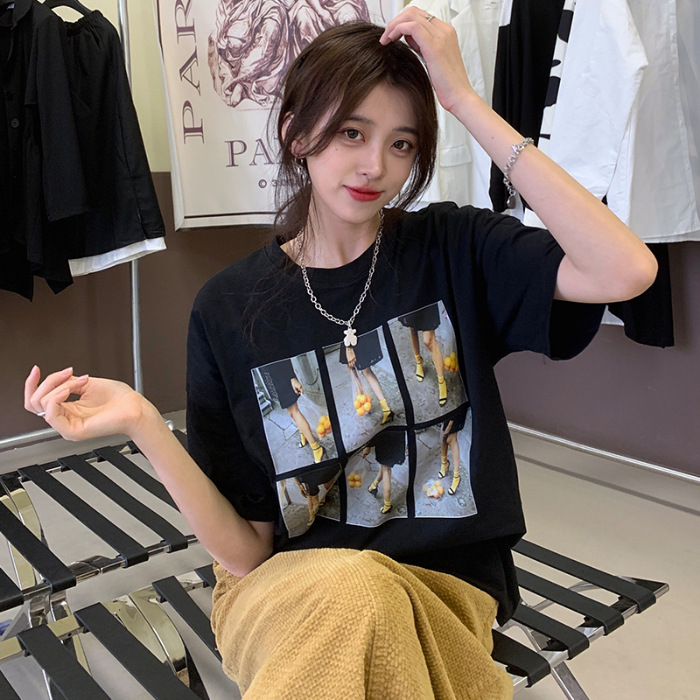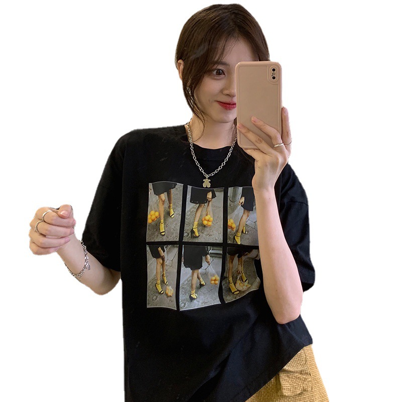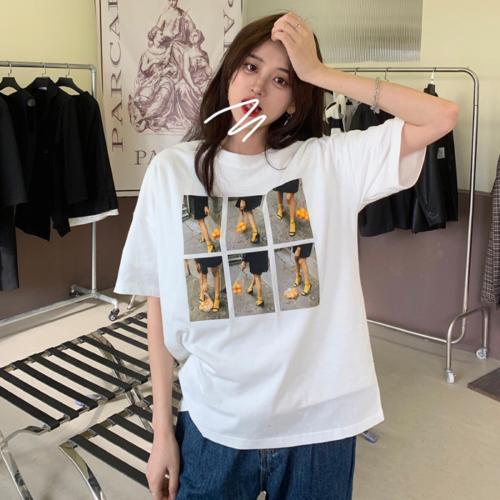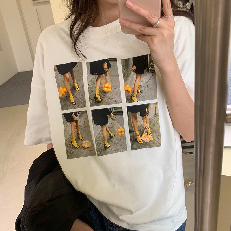 纯棉短袖T恤女夏季新款个性印花宽松BF风白色圆领别致上衣ins
