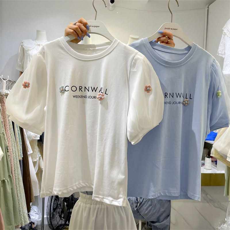 纯棉减龄设计感立体花朵装饰短袖T恤夏季新款女百搭字母印花上衣