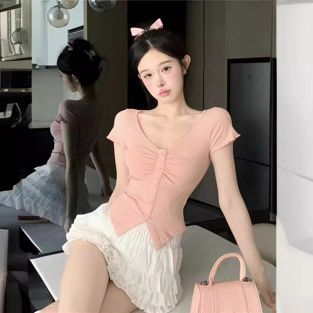 粉色甜美风不规则褶皱短袖t恤女夏季小个子甜辣纯欲风V领短款上衣
