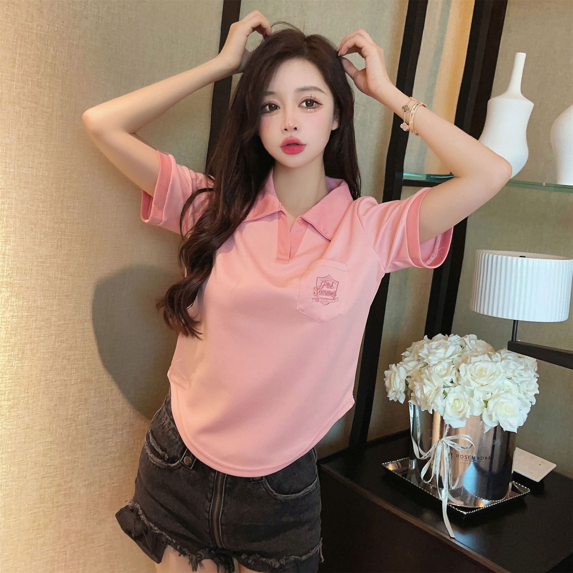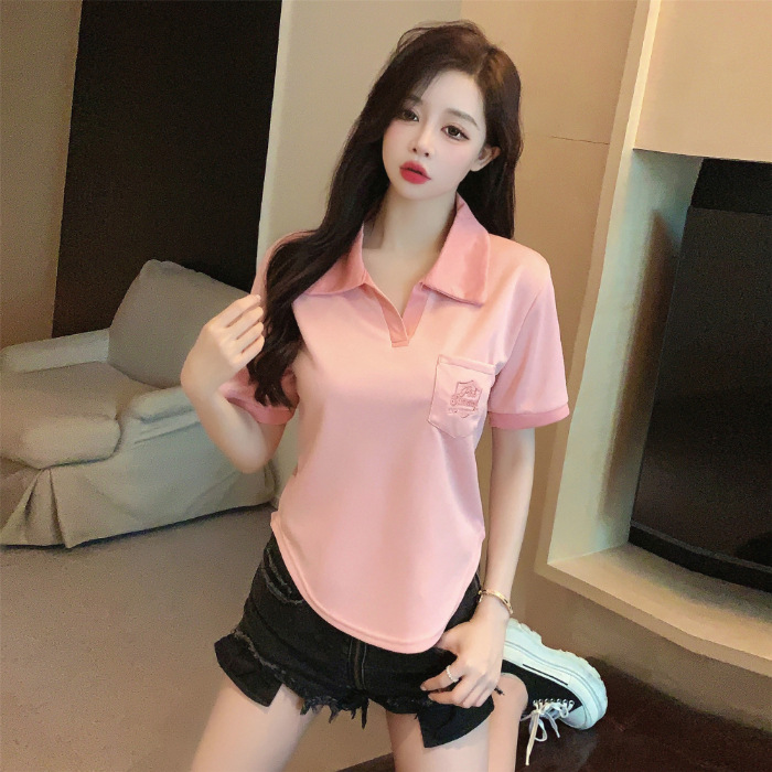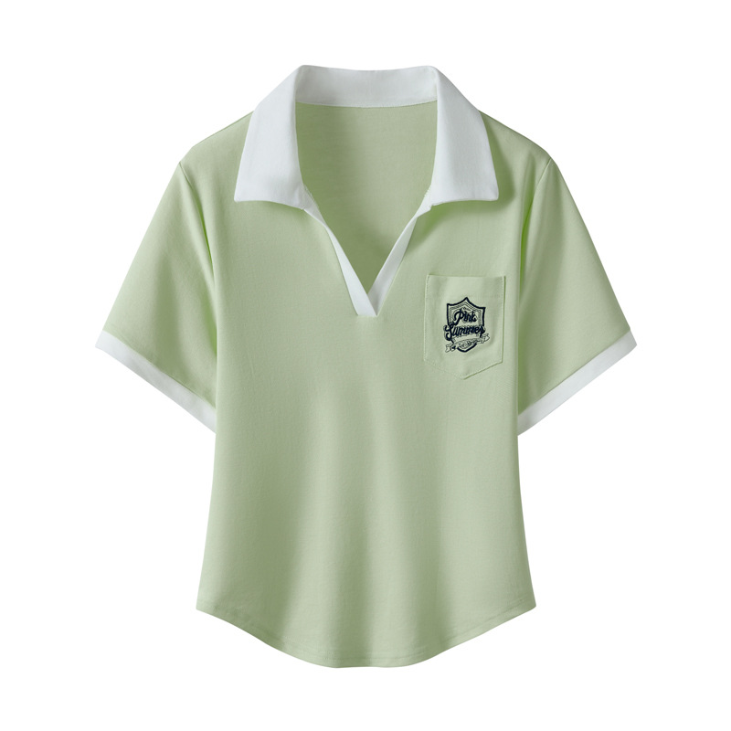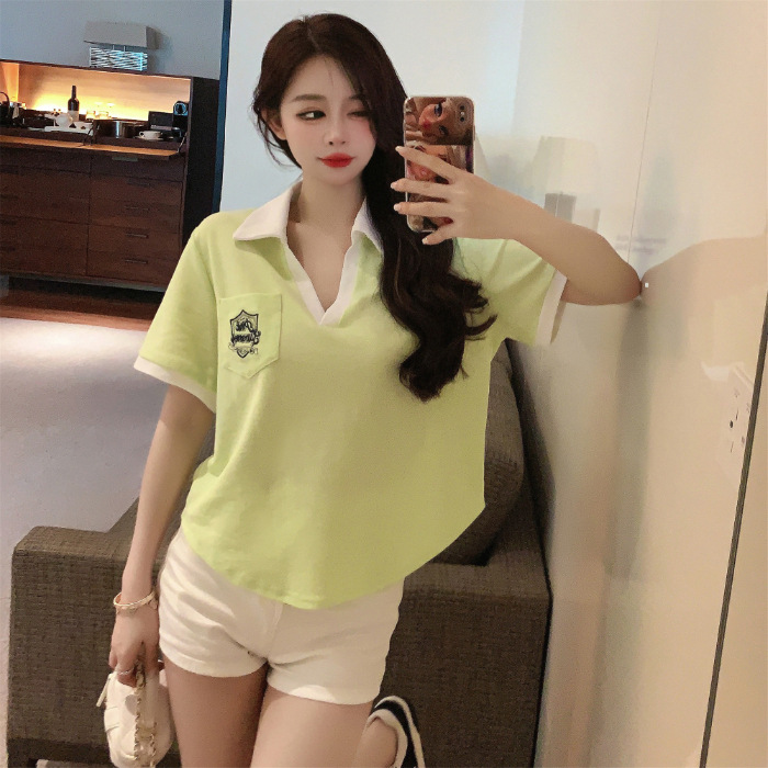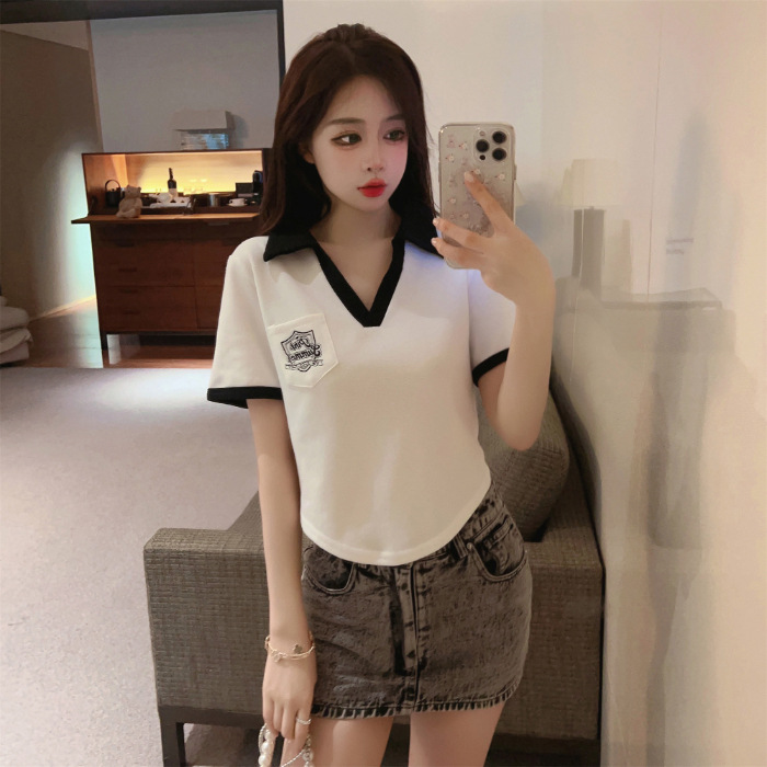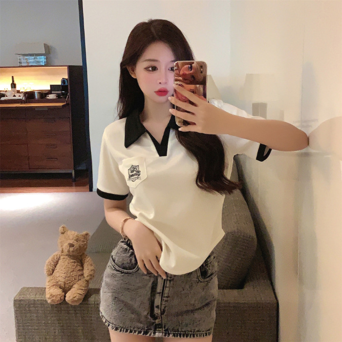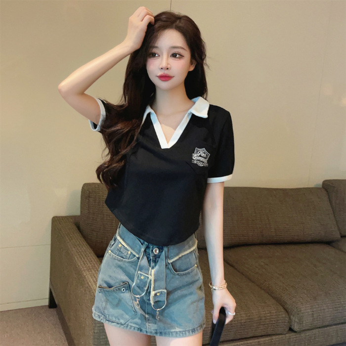 美式复古正肩Polo衫夏宽松短袖T恤女设计感小众别致短款辣妹上衣