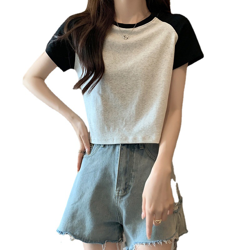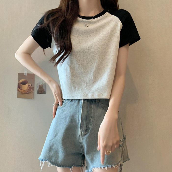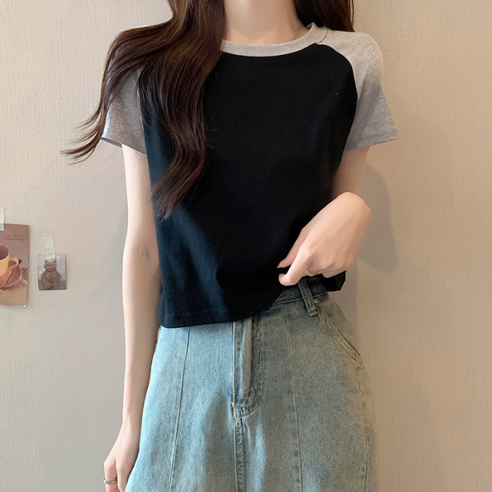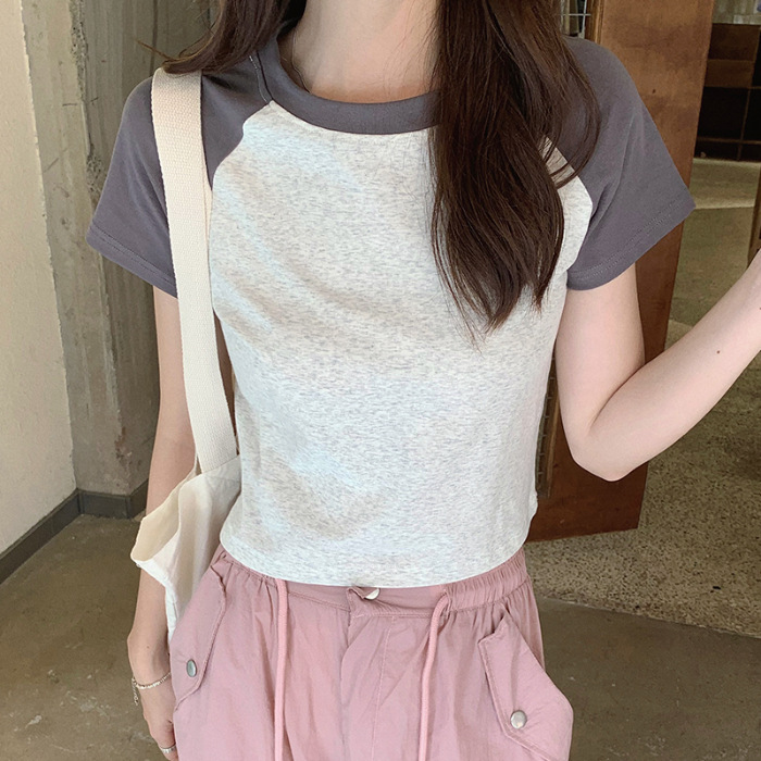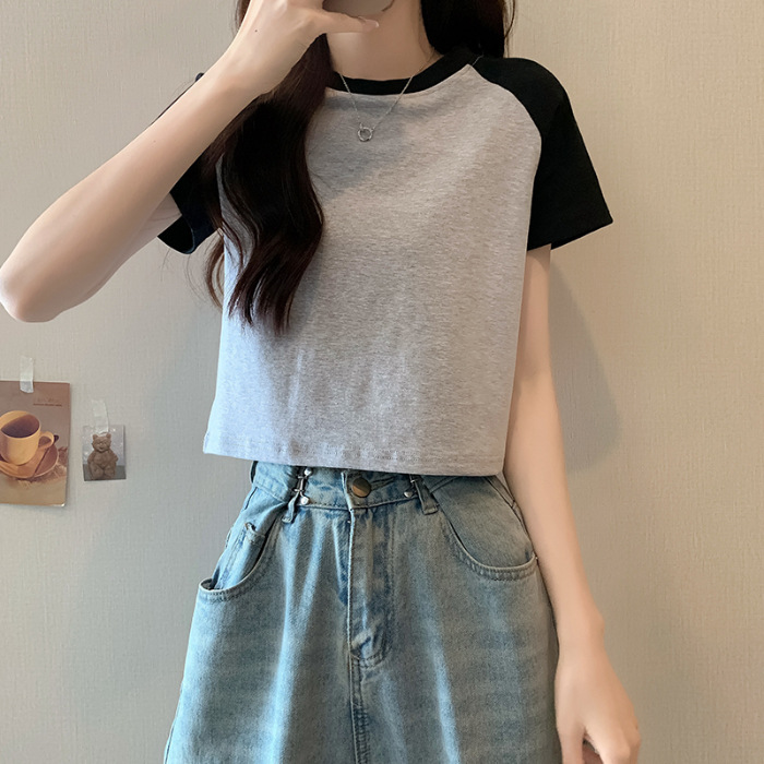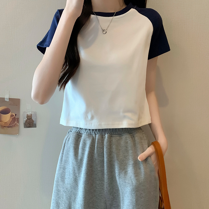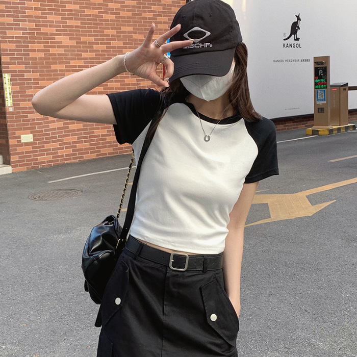 夏季甜辣妹插肩拼接露肚脐短袖T恤女复古百搭设计感撞色短款上衣
