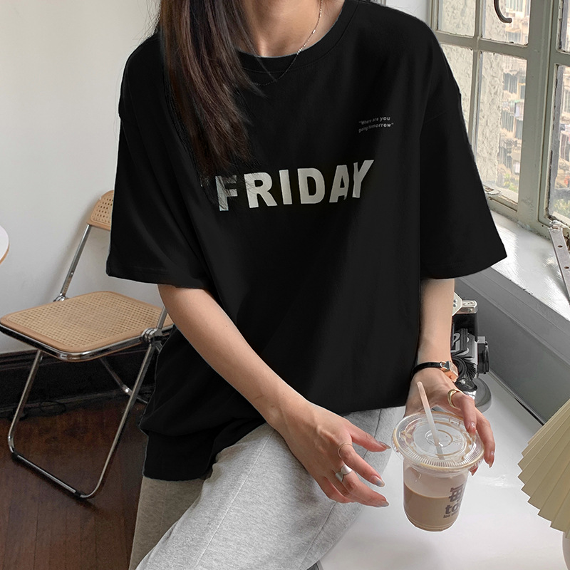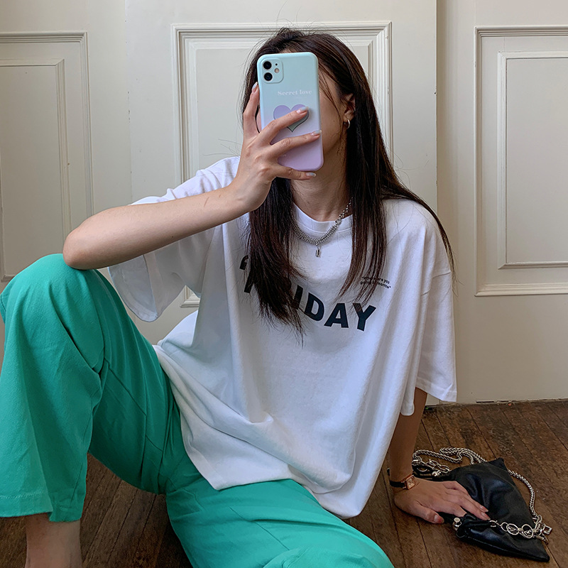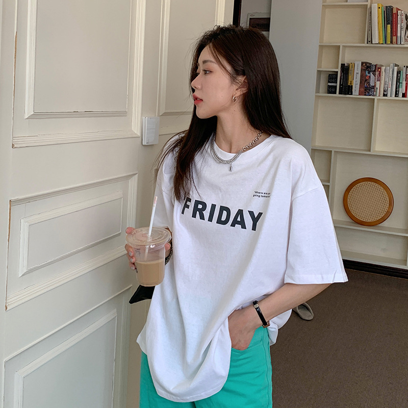 夏季纯棉字母印花短袖T恤女宽松BF风百搭半袖港风chic上衣潮