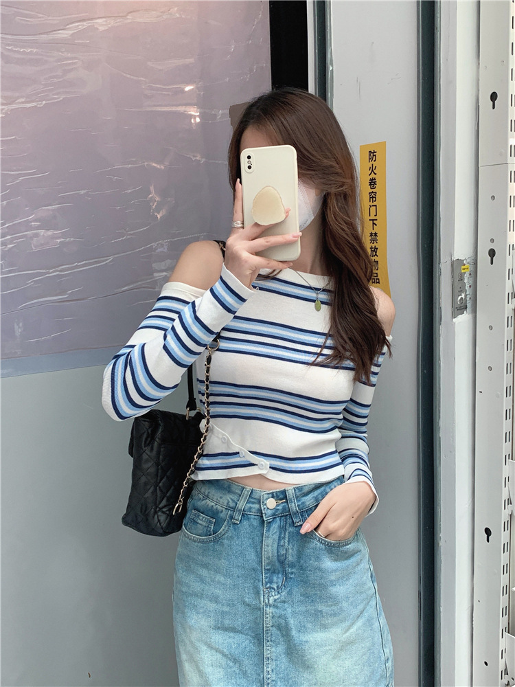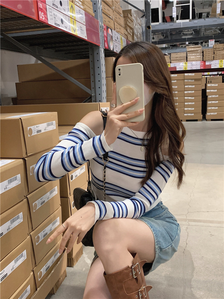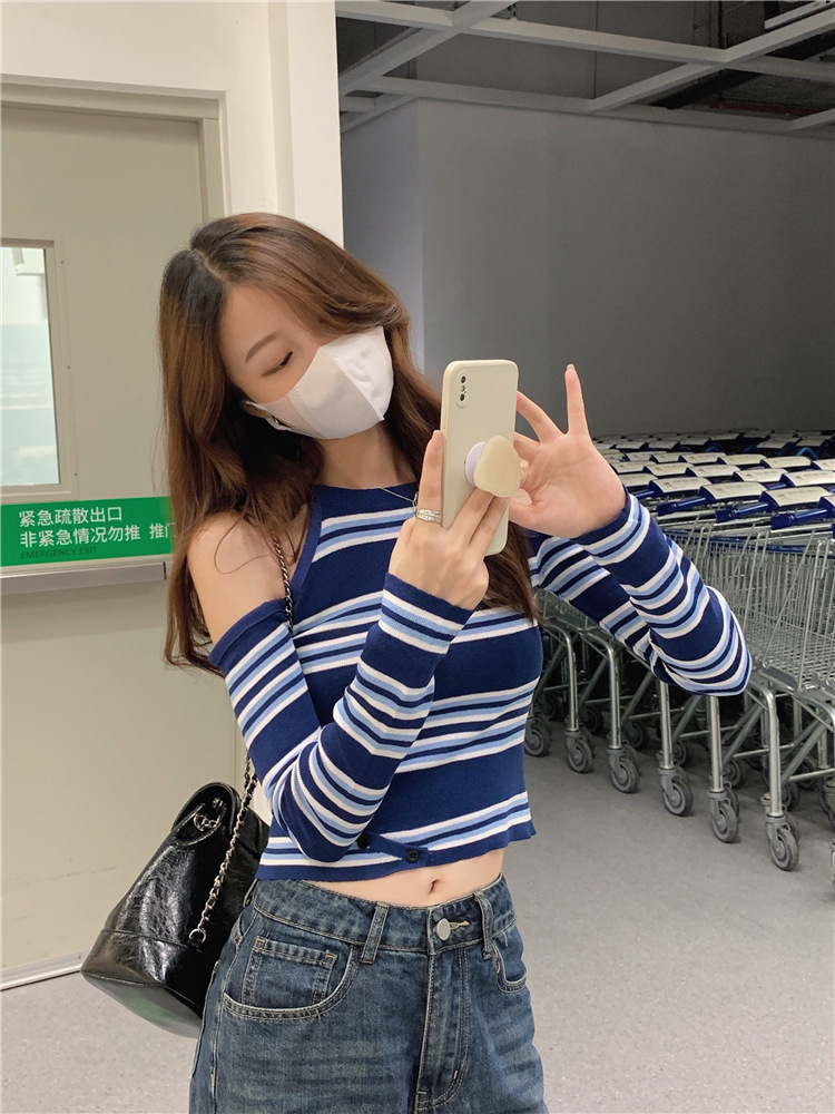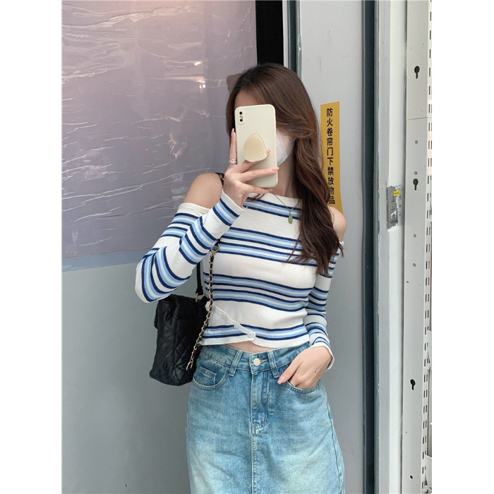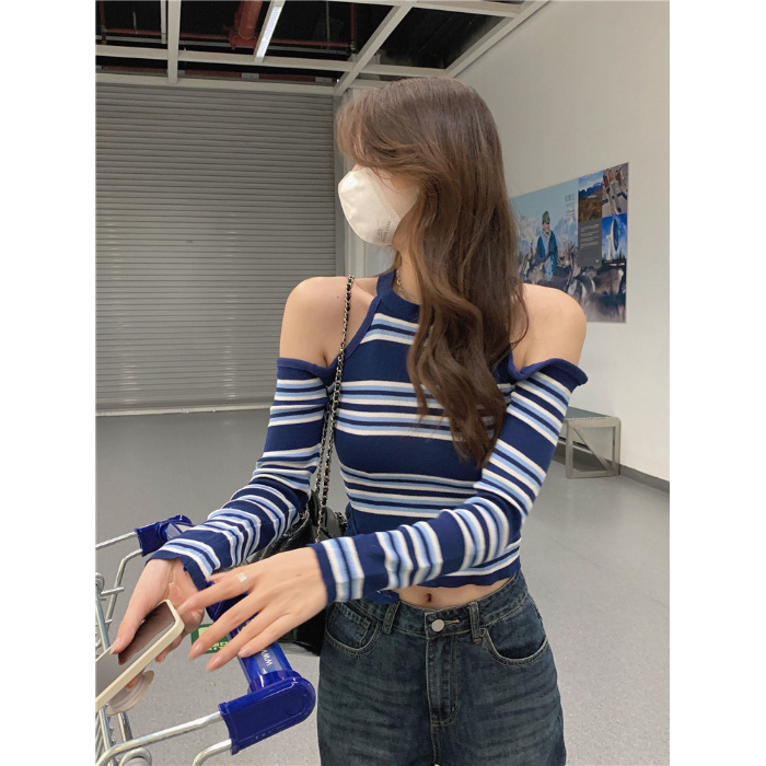 早秋新款条纹挂脖露肩长袖T恤女小众设计感修身显瘦短款辣妹上衣