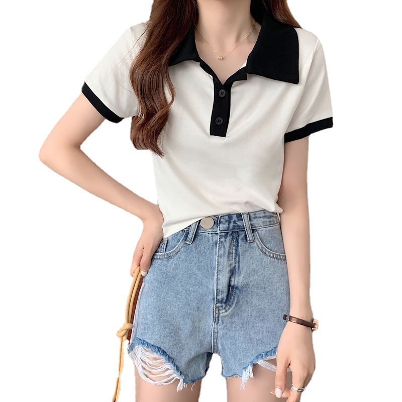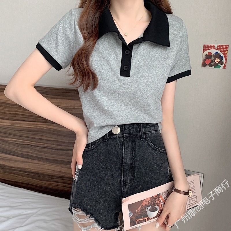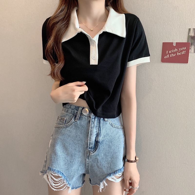 年撞色领正肩短袖恤女夏薄短款别致上衣设计感小众显瘦
