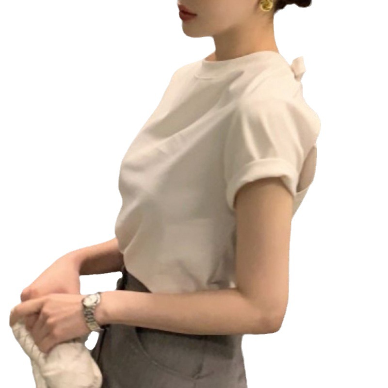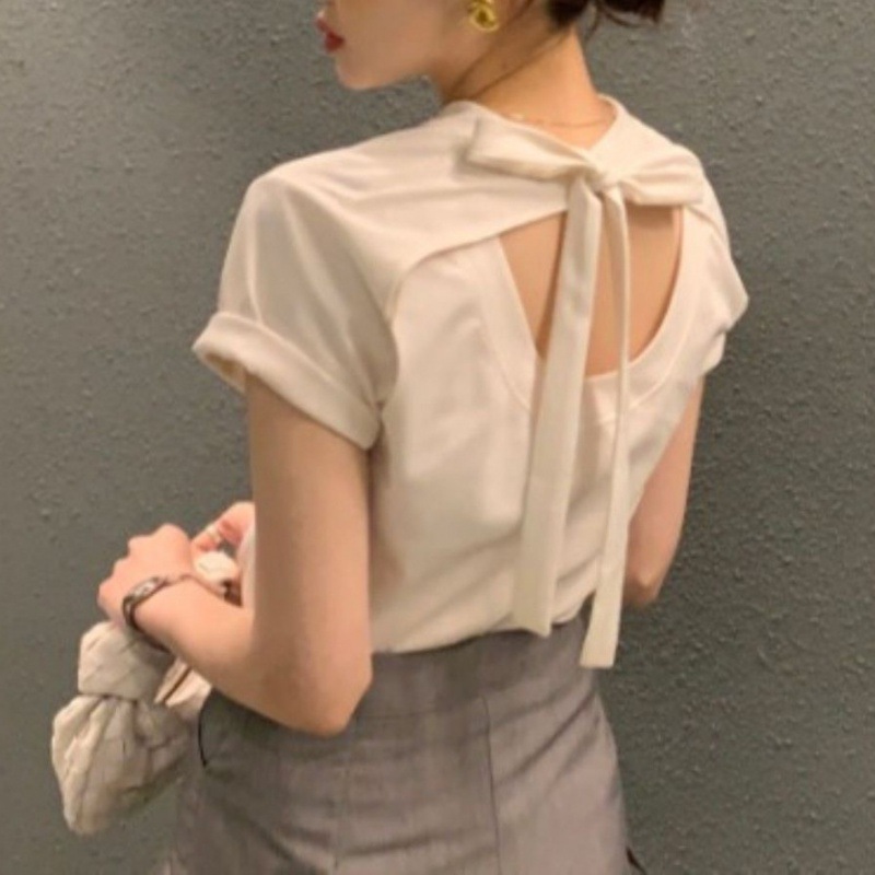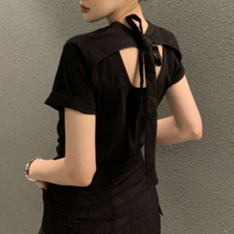 短袖t恤女露背上衣T新款夏季修身蝴蝶结系带设计感镂空打底衫