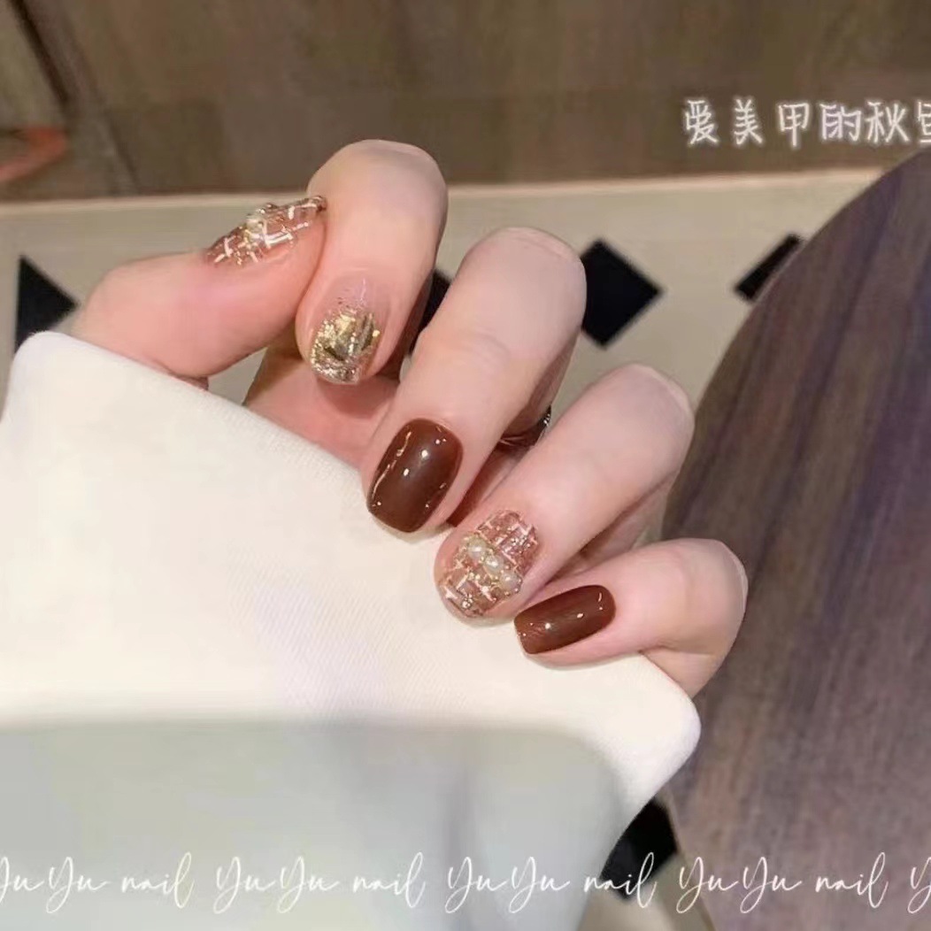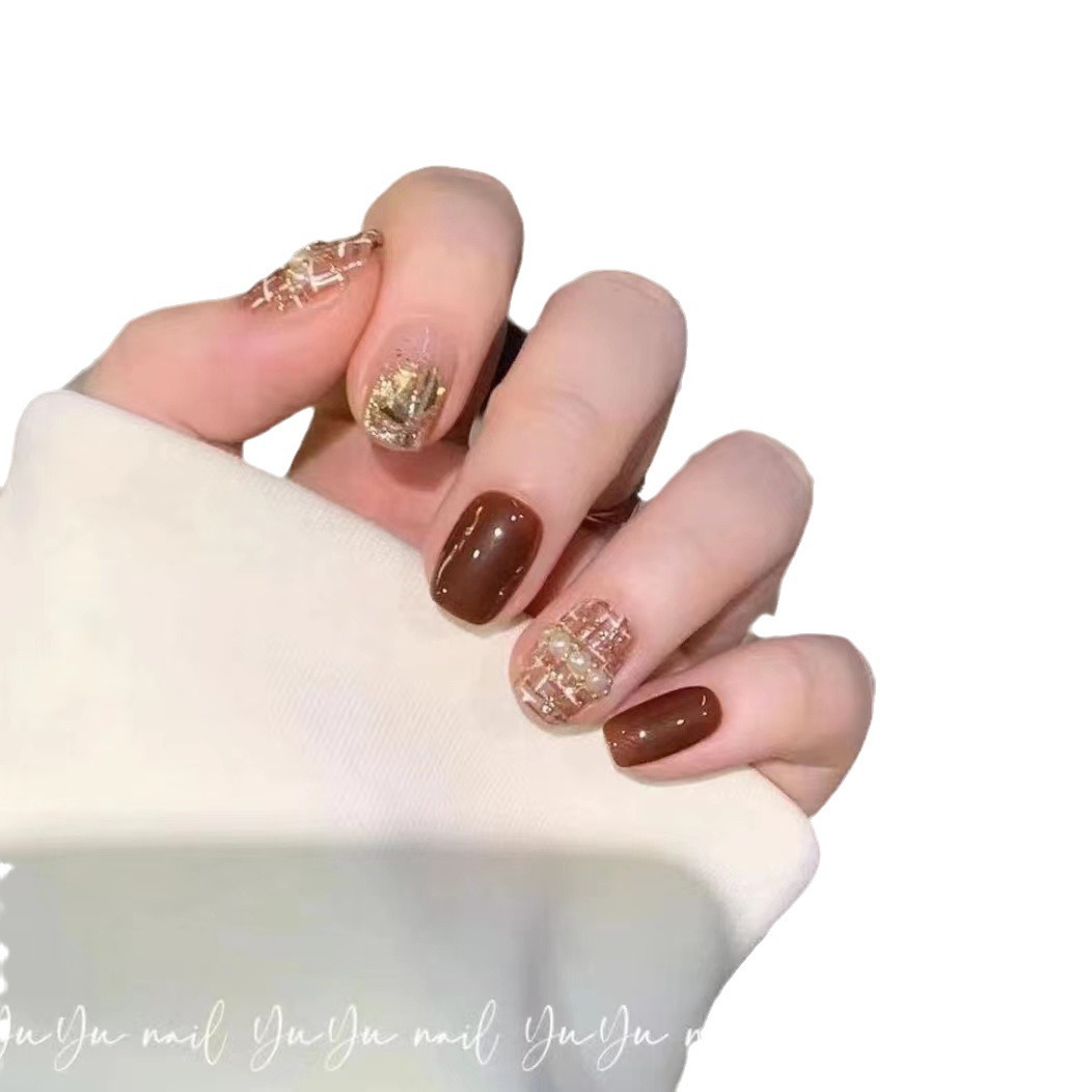 纯手工光疗穿戴甲气质棕小香风成品重复使用美甲贴片可拆卸