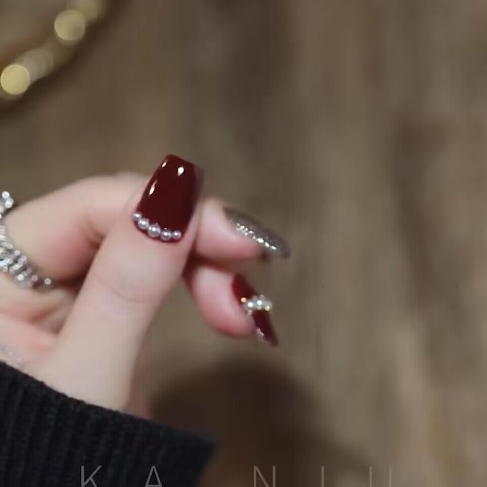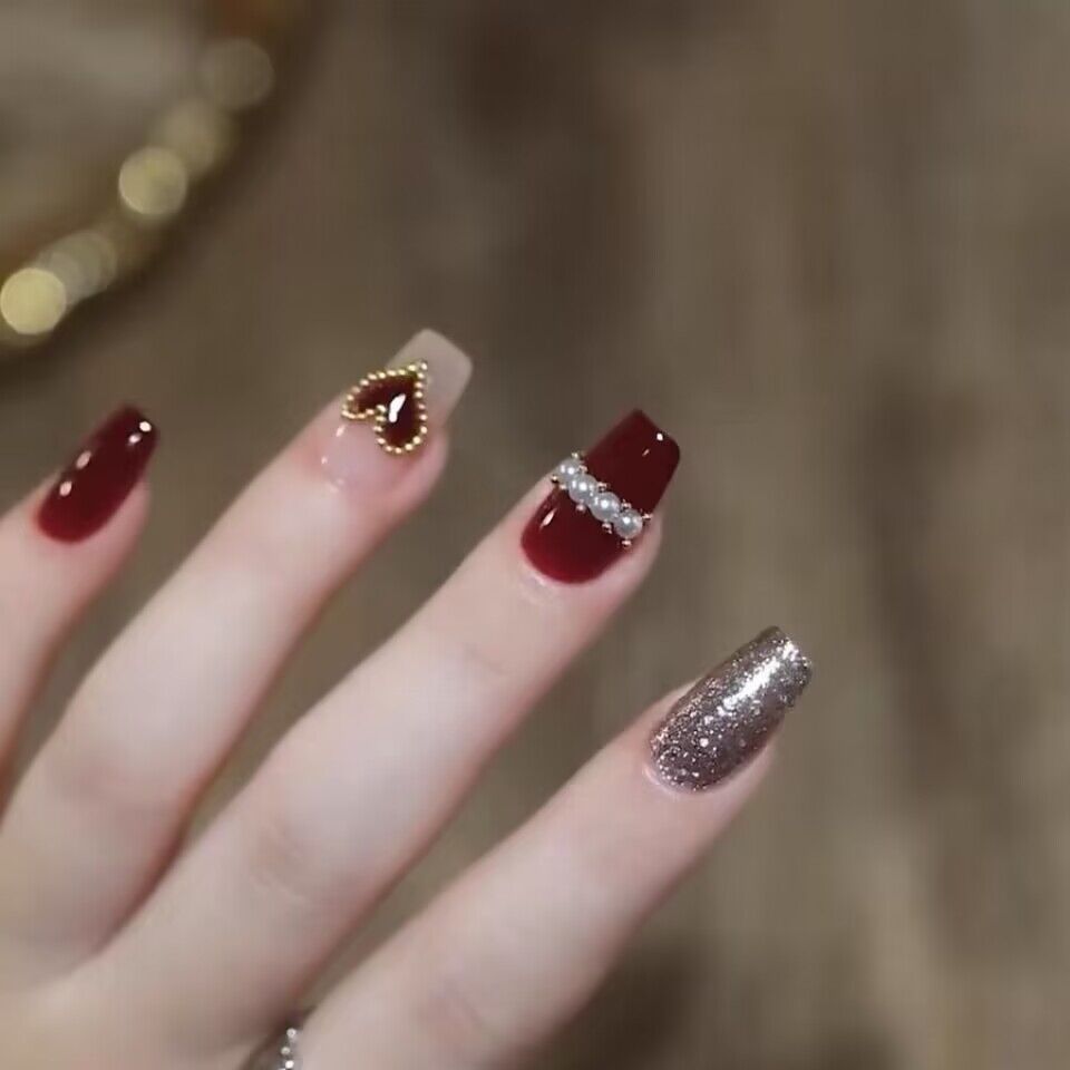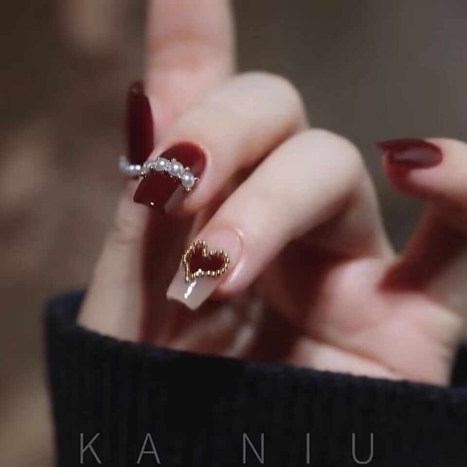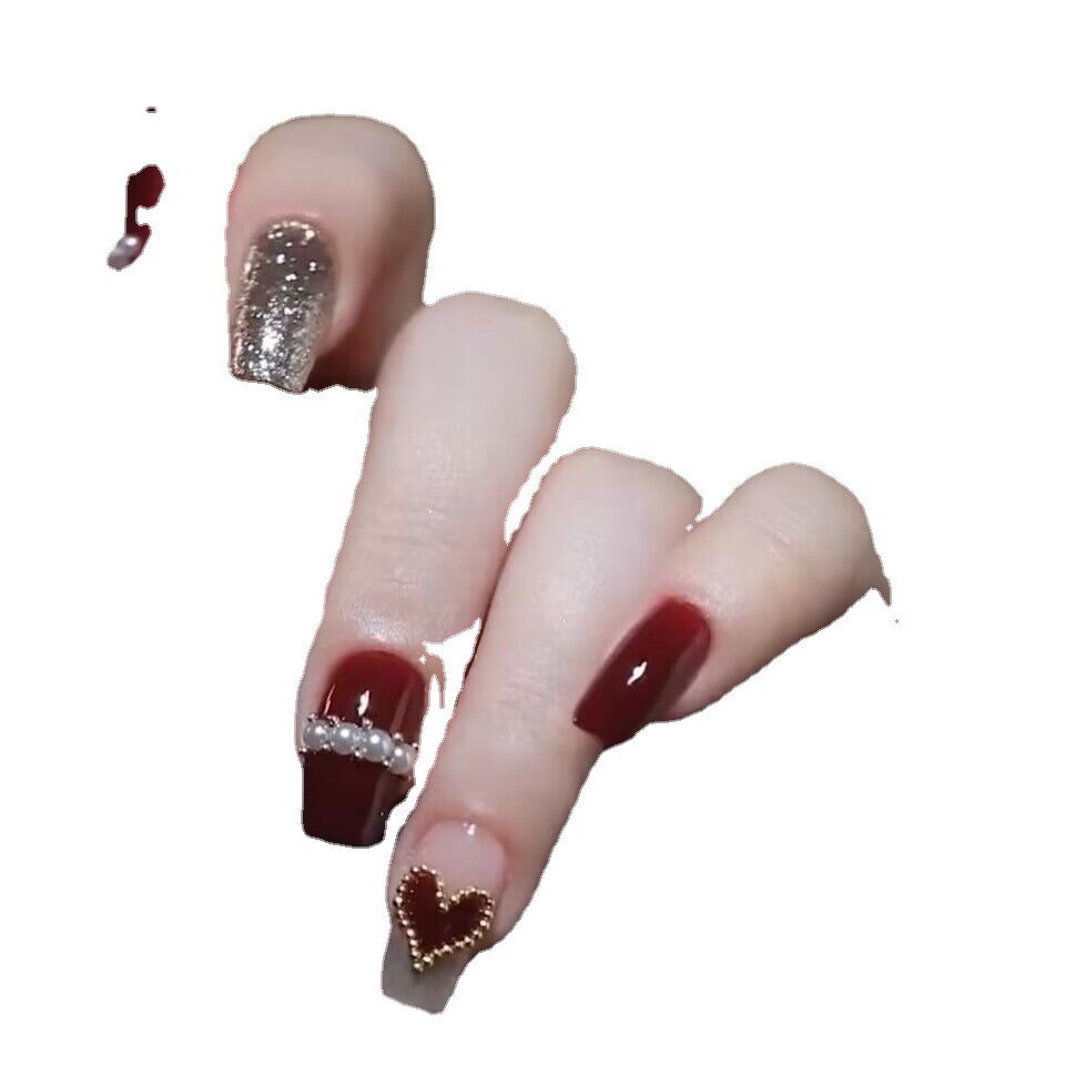 纯手工光疗穿戴甲 酒红爱心成品重复使用美甲贴片
