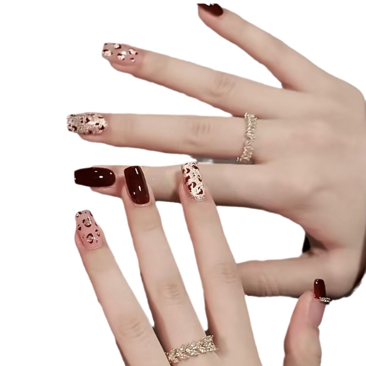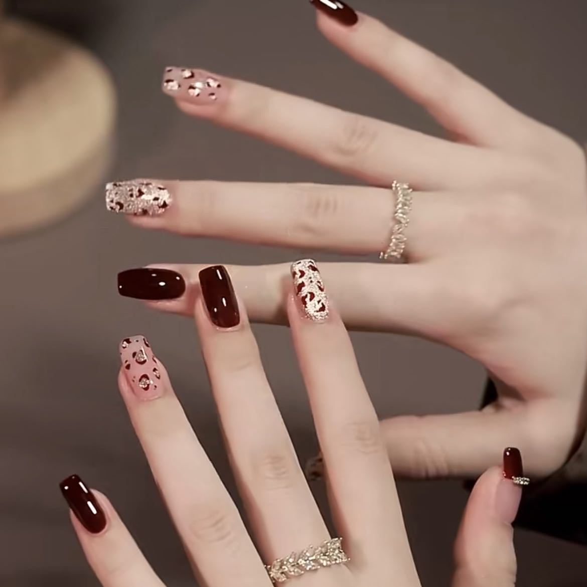 纯手工光疗穿戴甲酒红豹纹成品重复使用美甲贴片可拆卸