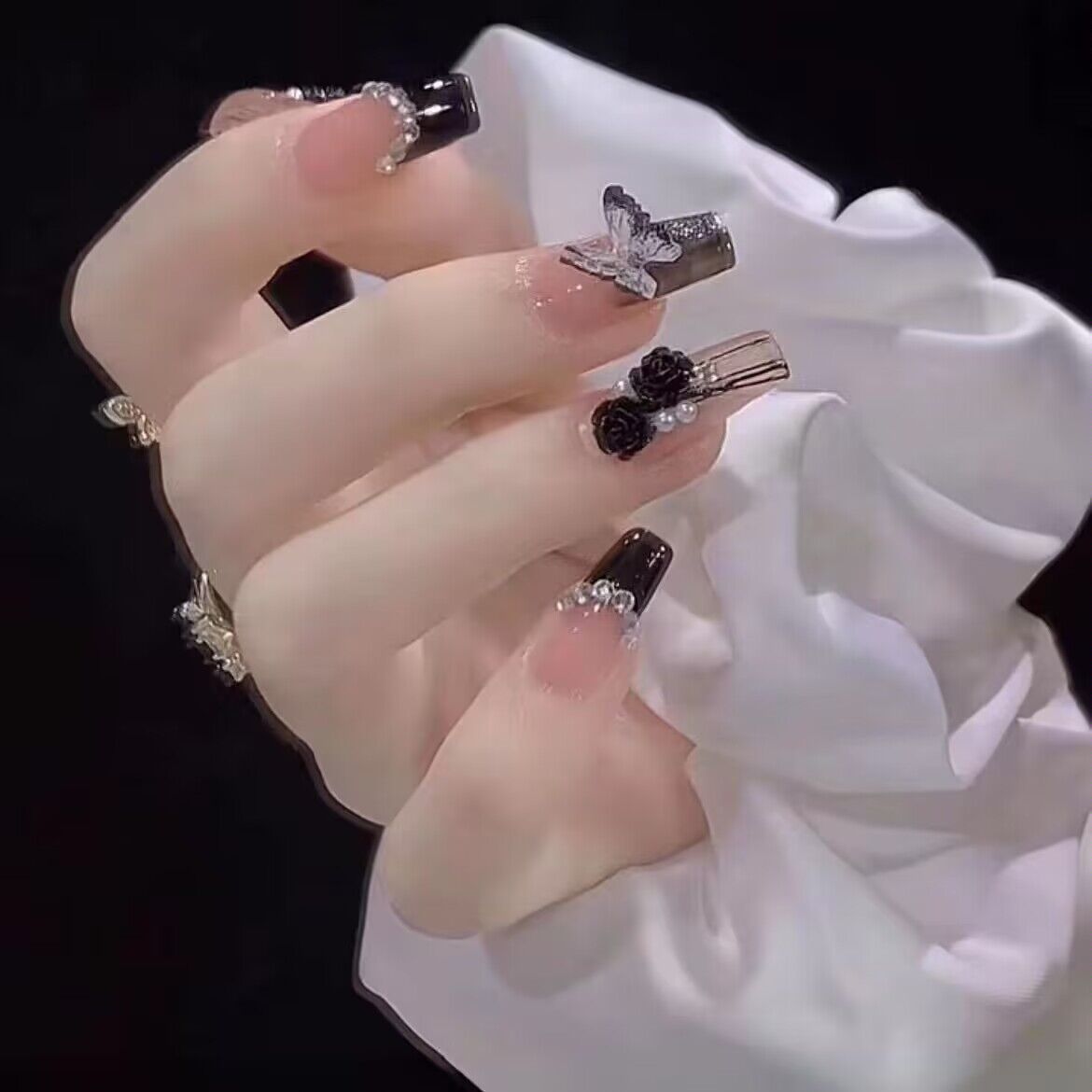 纯手工光疗穿戴甲 黑色山茶花穿戴甲成品重复使用美甲贴片