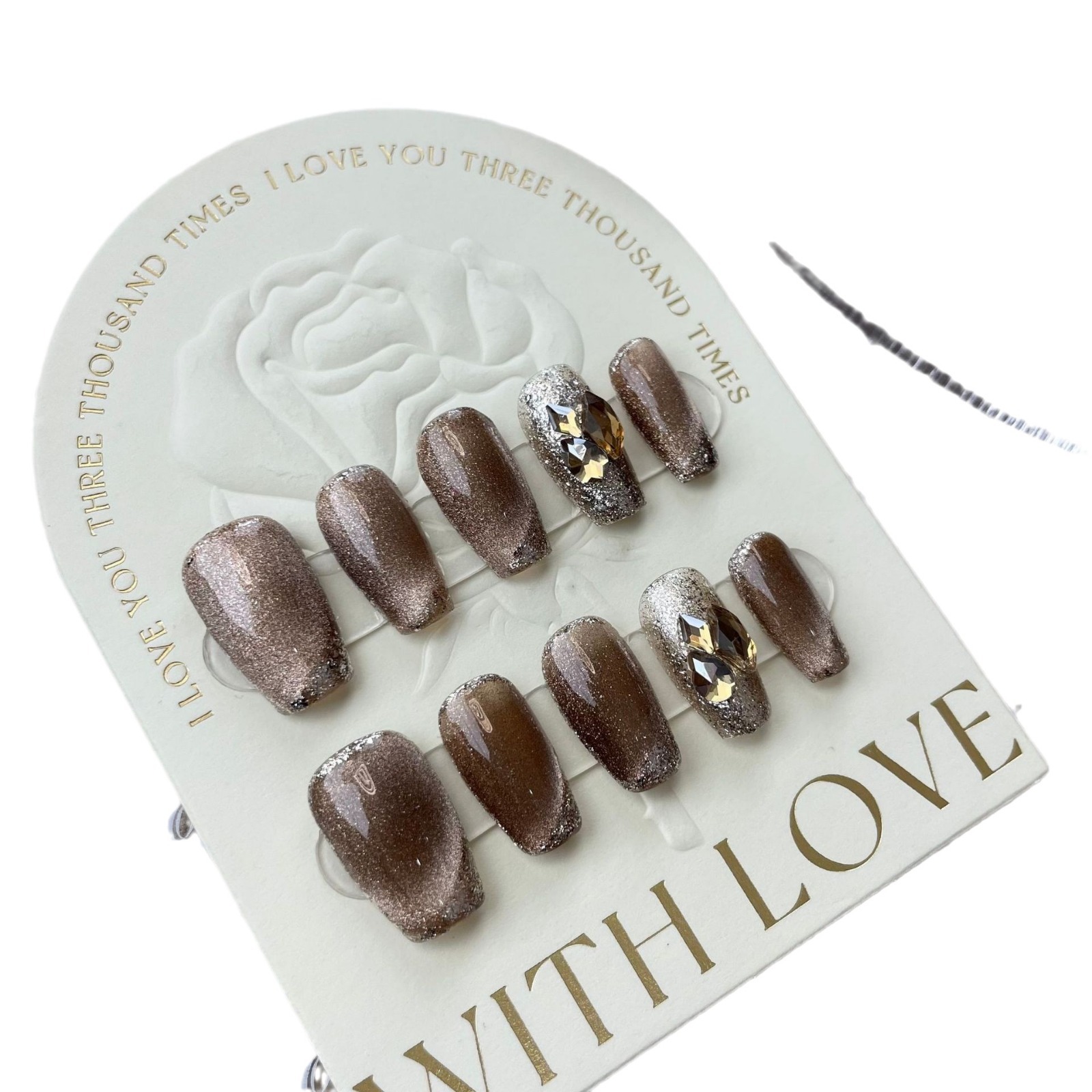 【生椰拿铁】纯手工穿戴甲片新款猫眼咖色香槟钻爆闪