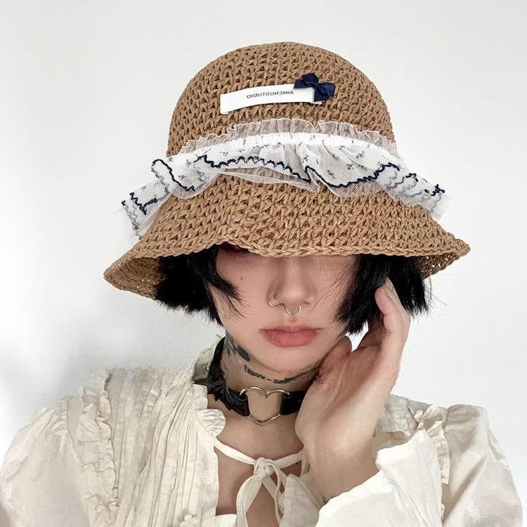 韩系度假风蕾丝少女渔夫帽女海边遮阳编织太阳帽子女大檐甜美草帽
