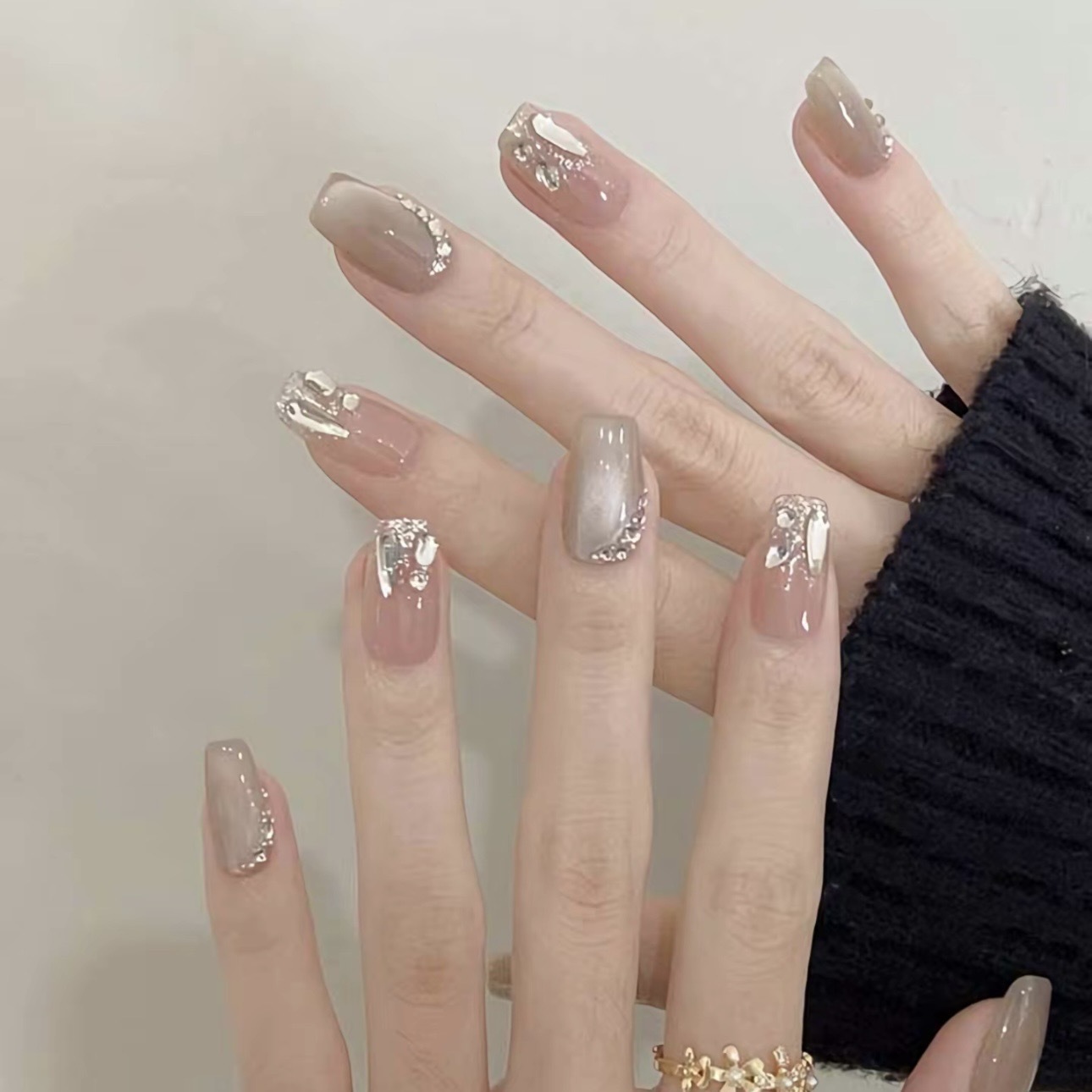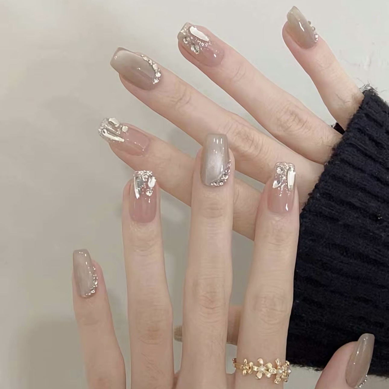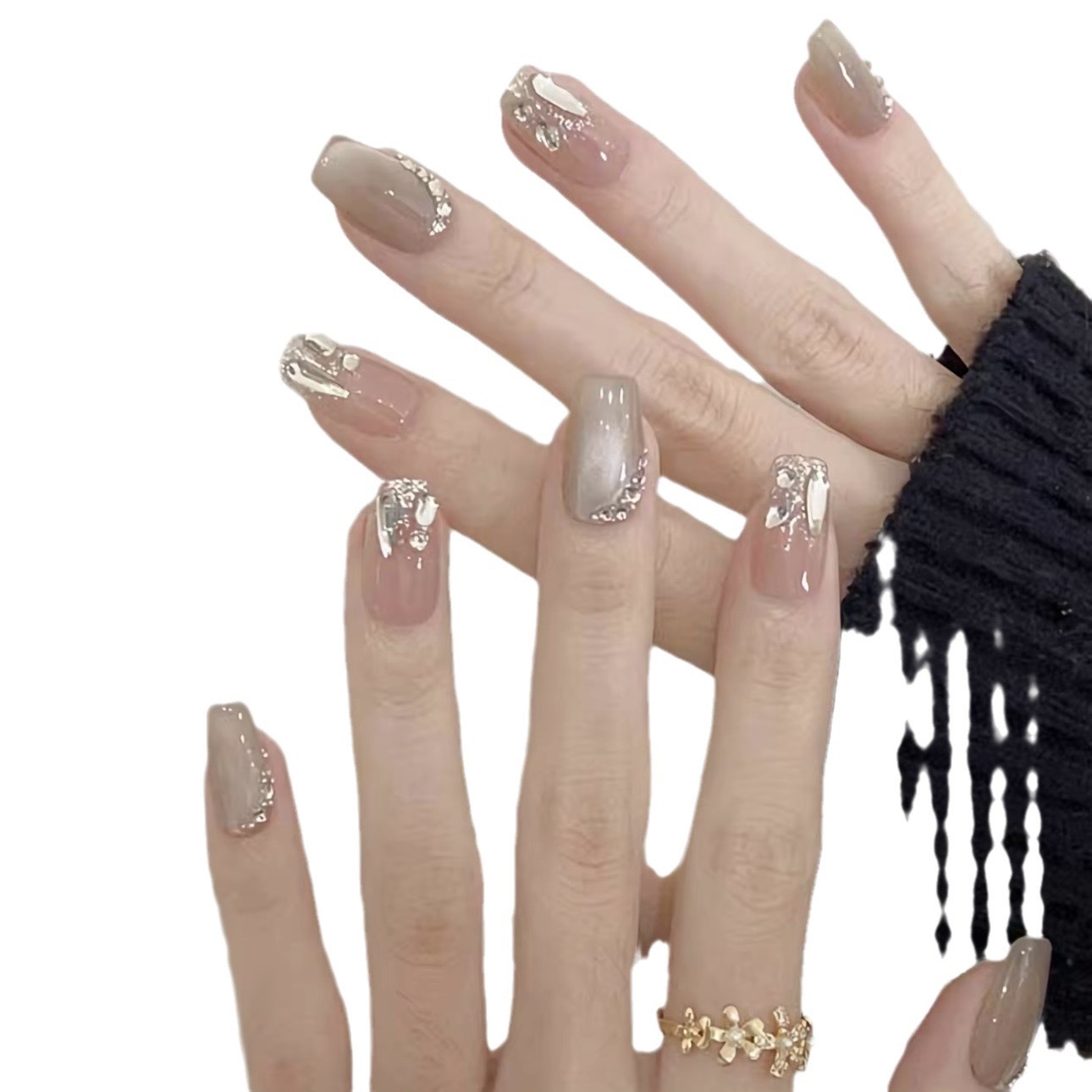 纯手工光疗穿戴甲白兰地猫眼爆闪批发成品重复使用美甲贴片可拆卸