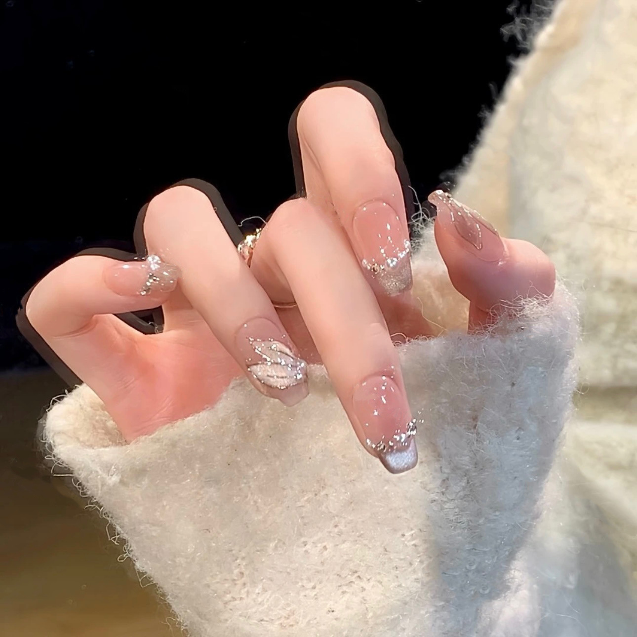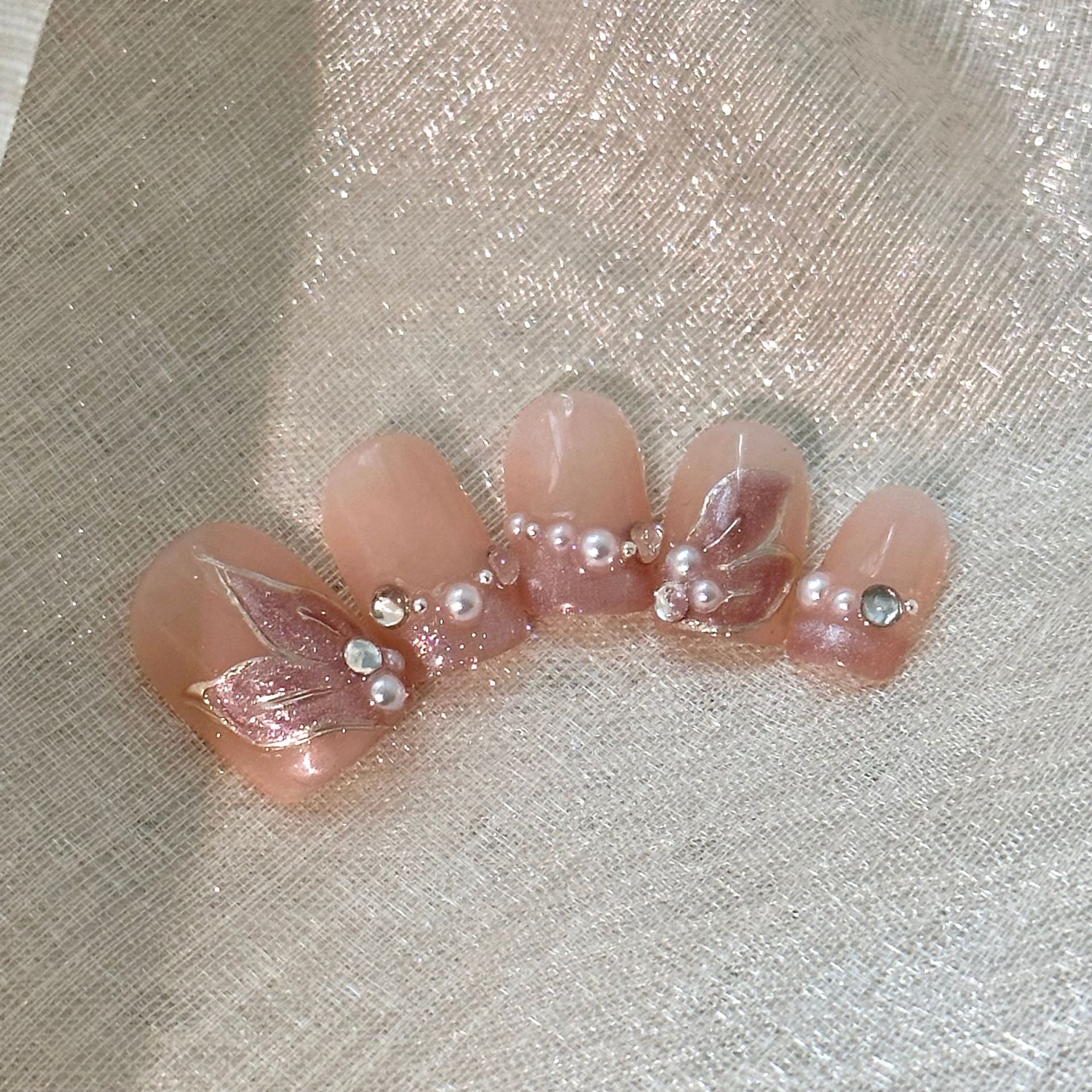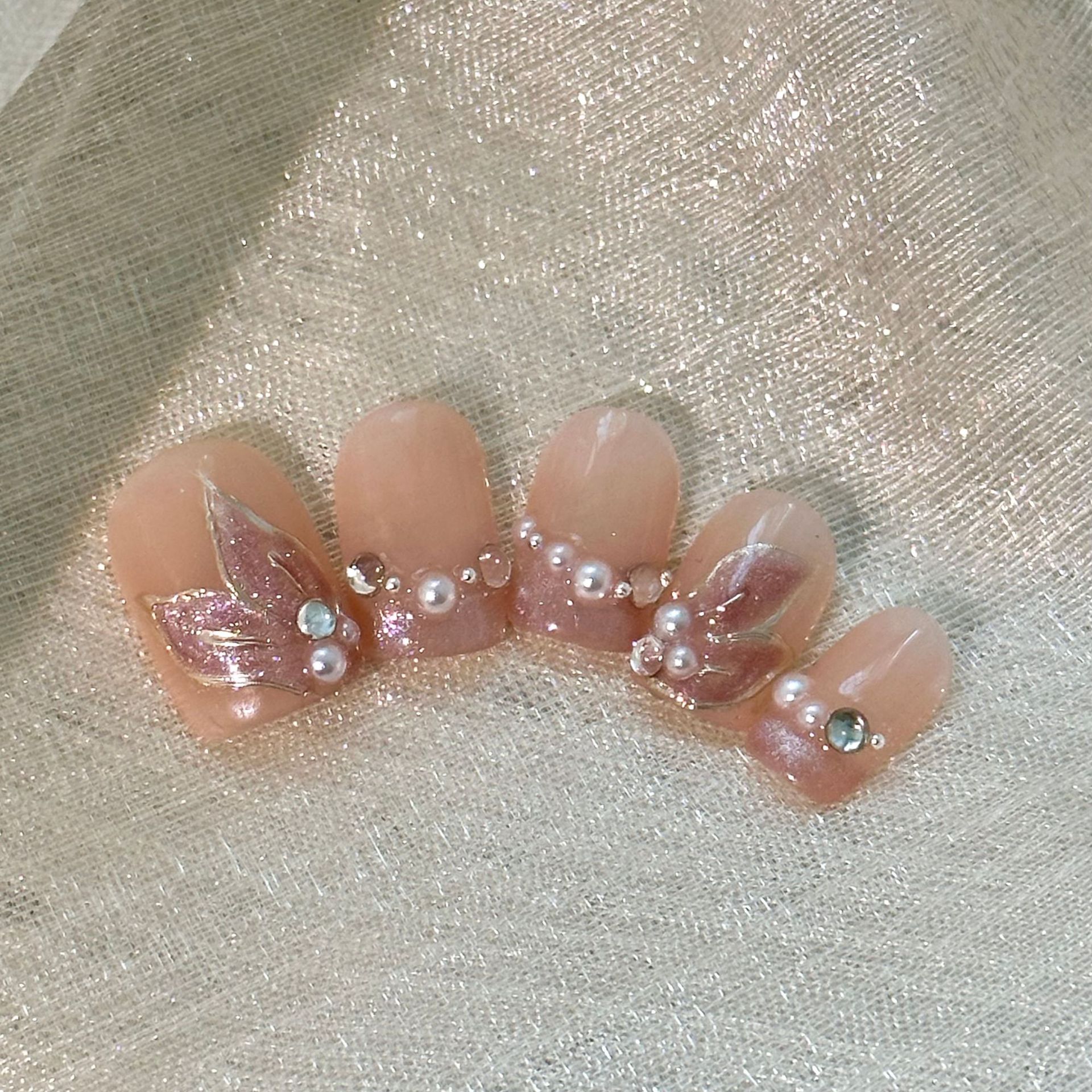 【人鱼传说】纯手工穿戴甲片温柔手绘纯欲粉晶石猫眼短款可爱珍珠