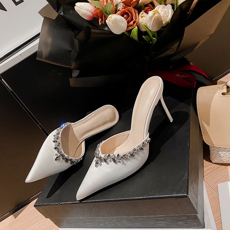 新款百搭白色尖头链条水钻高跟单鞋高级感绸缎包头细跟凉拖