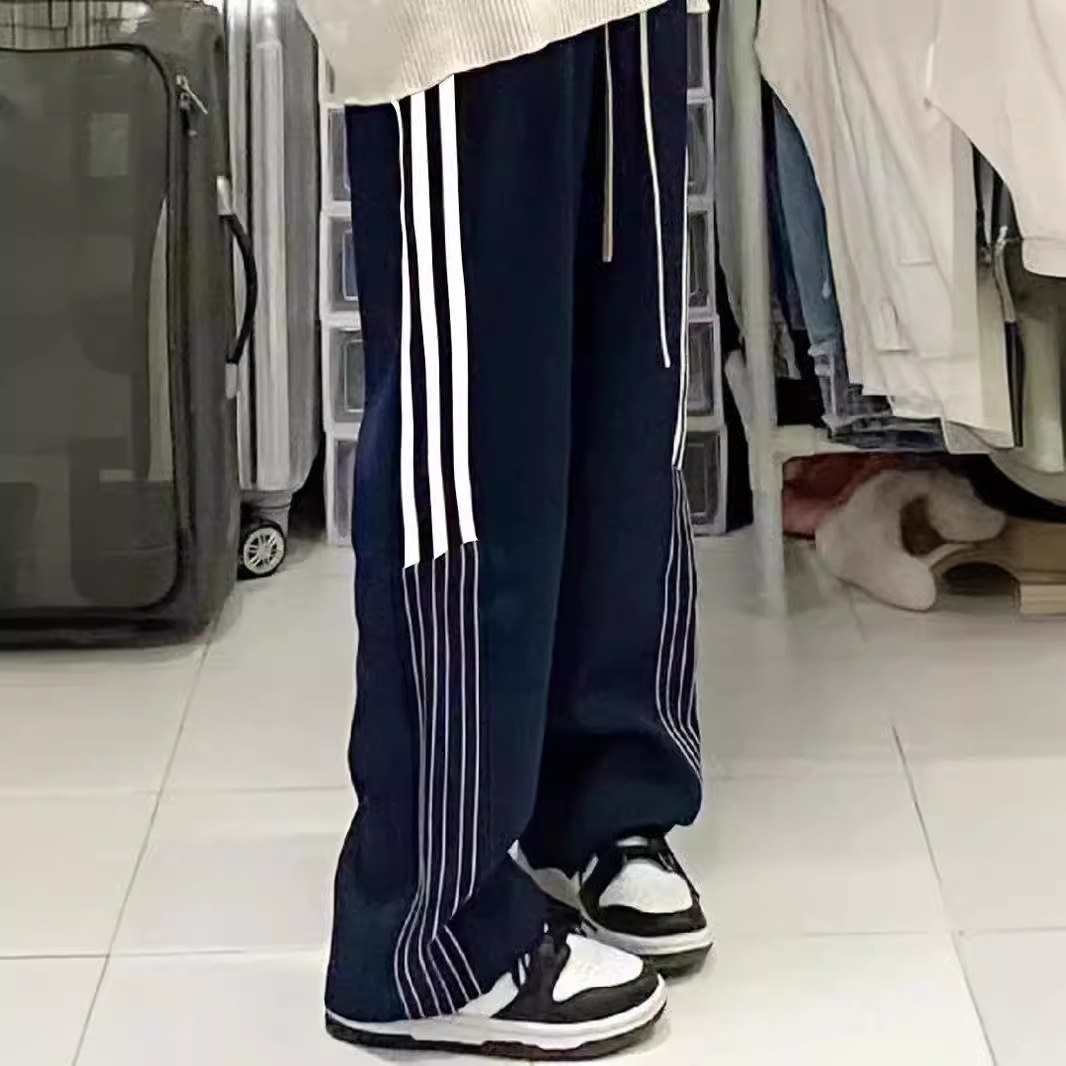 新款美式条纹运动裤女阔腿长裤子秋季韩版ins复古潮酷直筒休闲裤