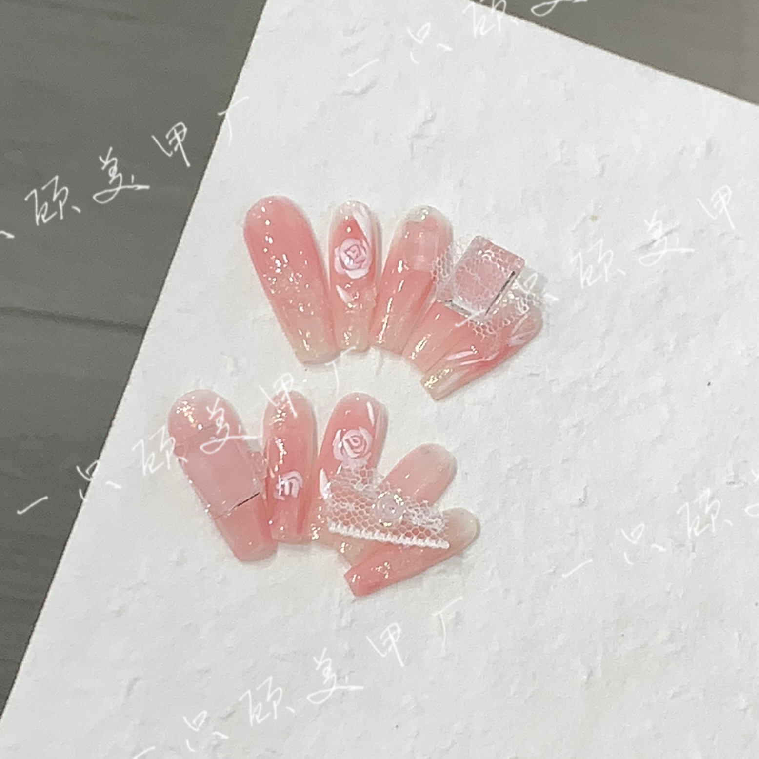 一只顾美甲厂【Y】原创实拍粉嫩少女柔情手绘玫瑰透底蕾丝方钻婉