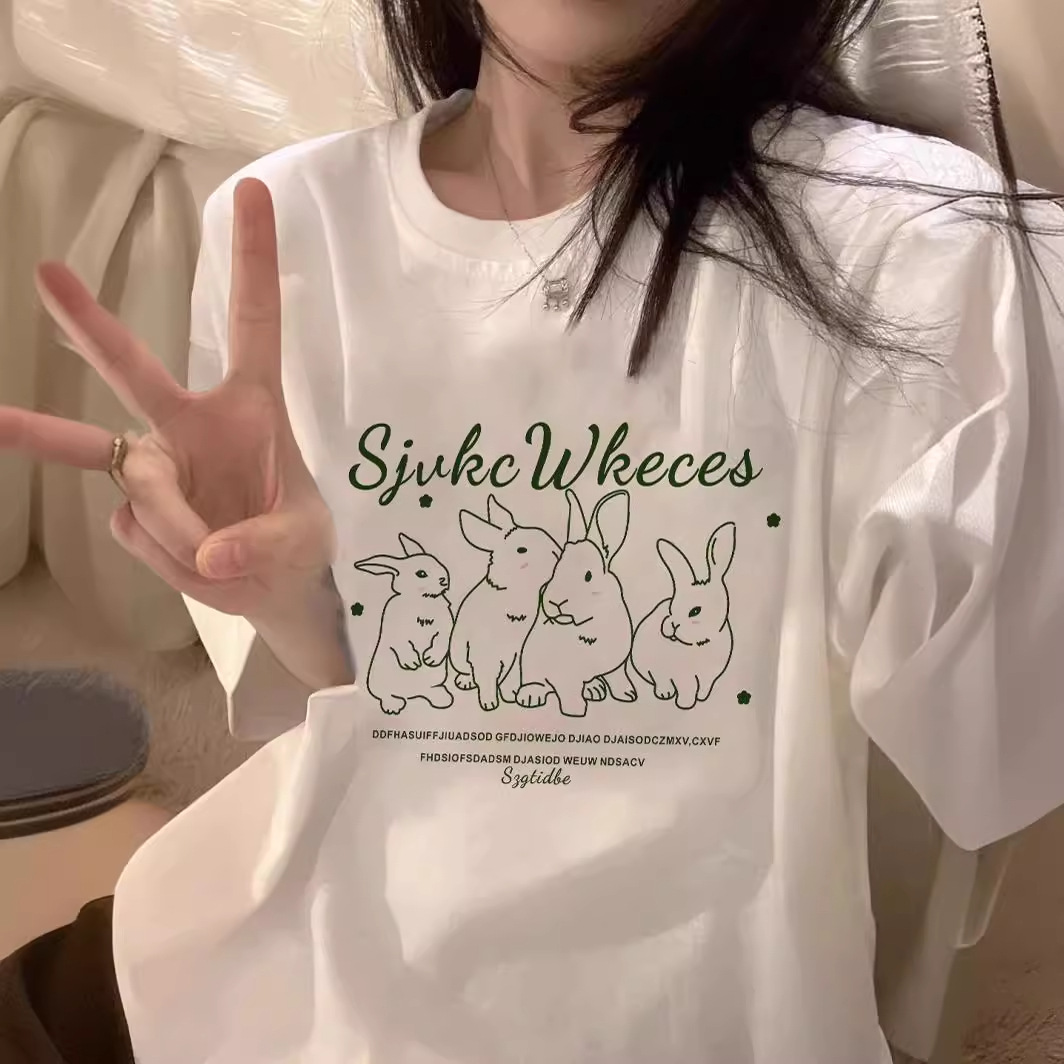 重磅纯棉兔子印花短袖t恤女oversize宽松半袖小众设计感上衣春夏