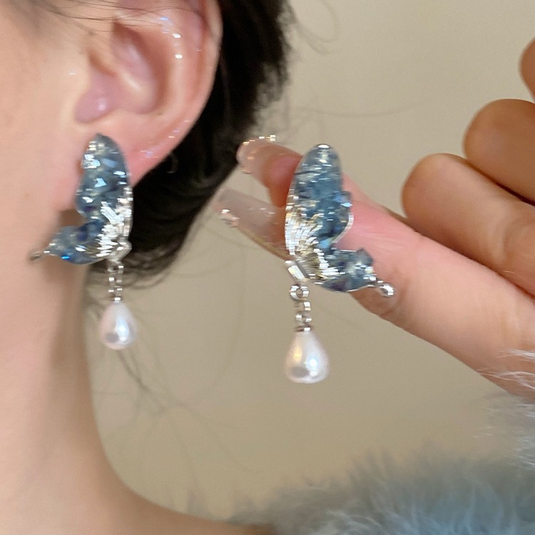 蓝水晶蝴蝶珍珠耳钉耳饰女轻奢高级感气质耳环小众设计感流苏耳坠