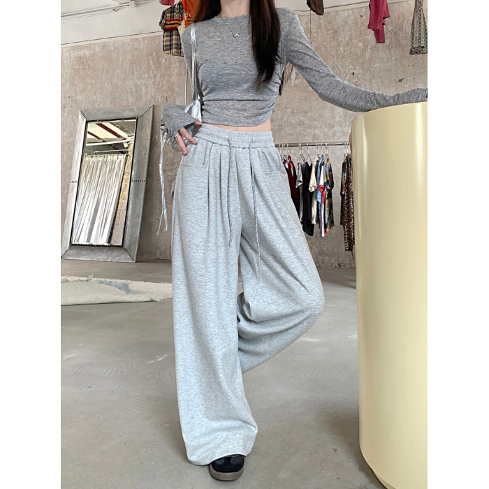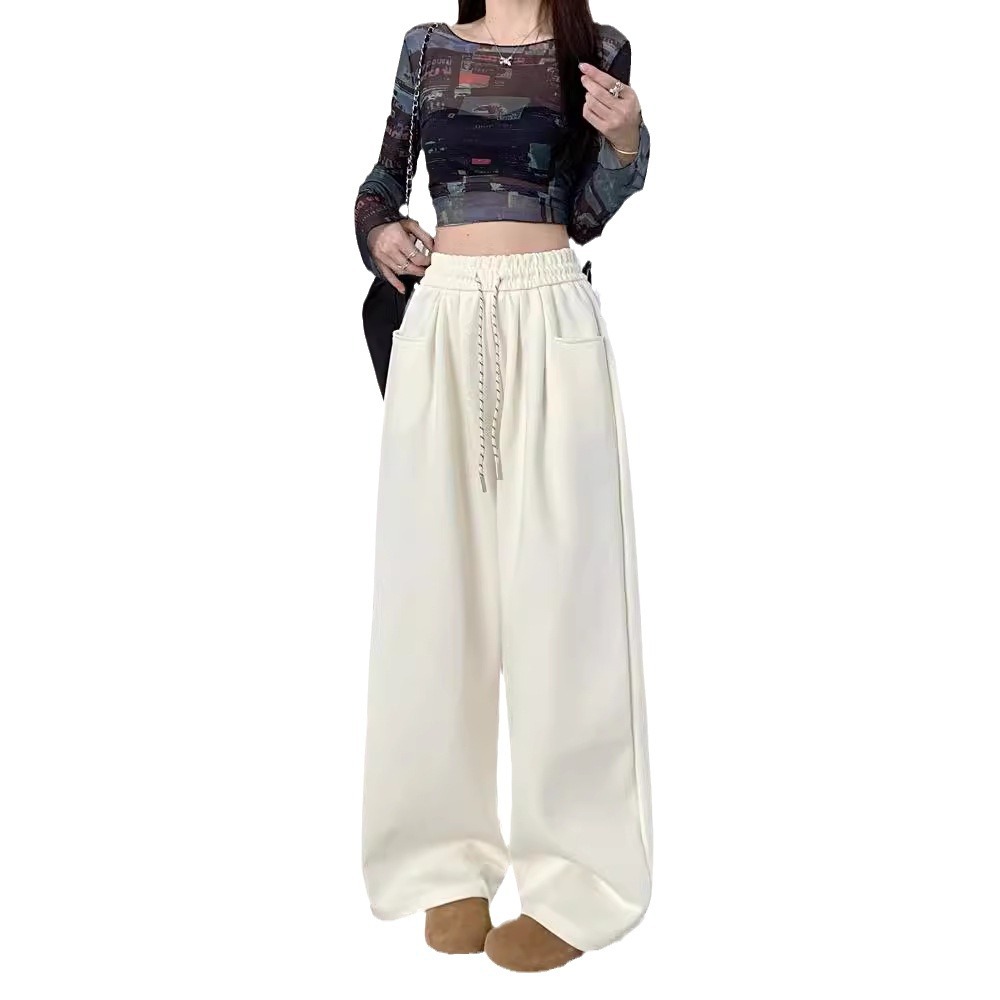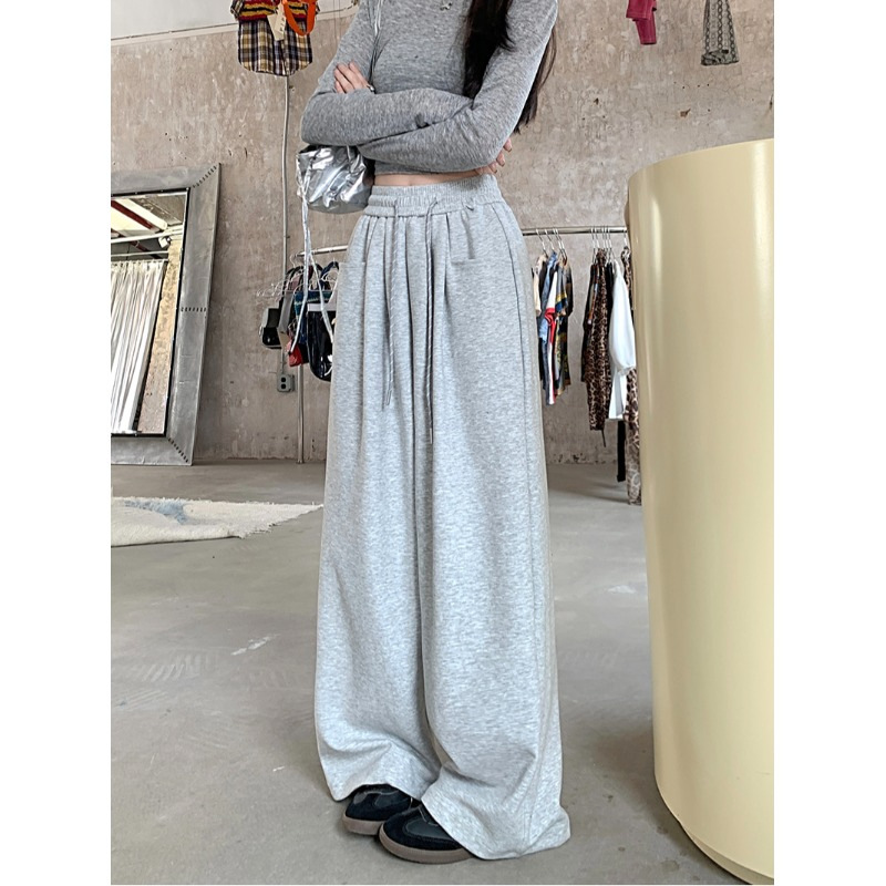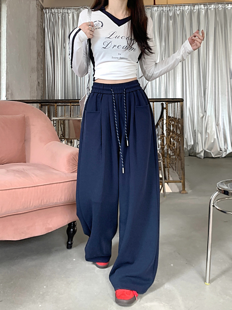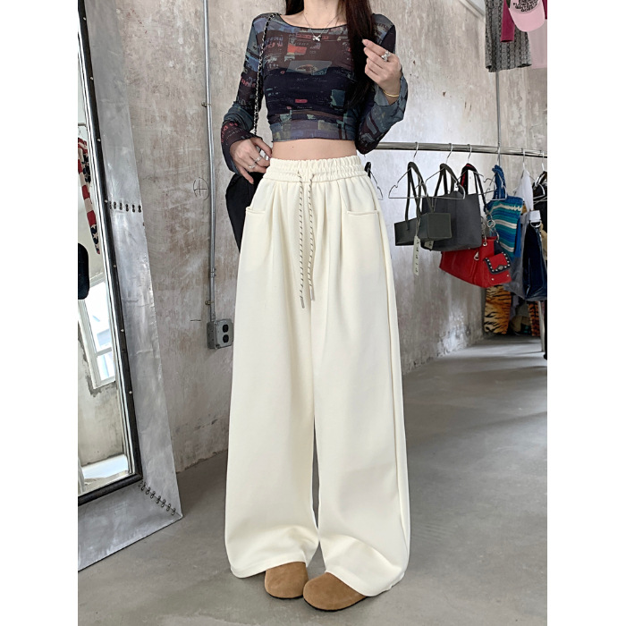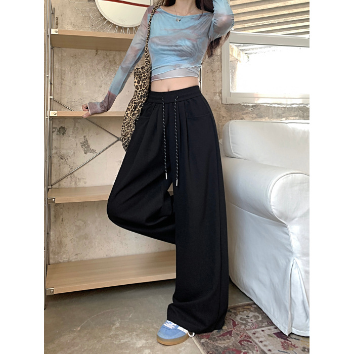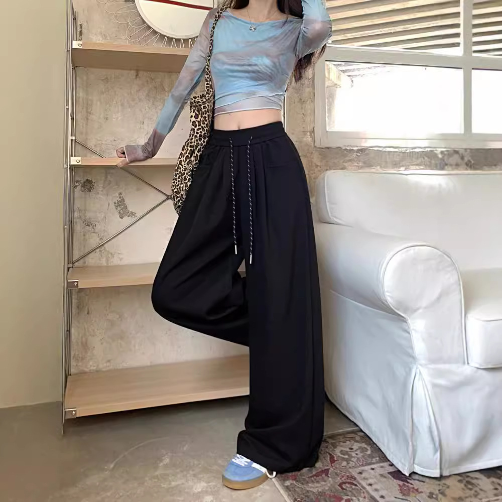 复古高腰抽绳直筒运动卫裤女秋季新款宽松显瘦休闲阔腿拖地裤