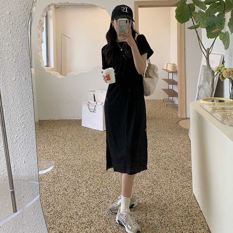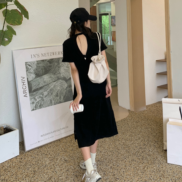 小心机露背连衣裙夏季新款设计感下摆分叉过膝长裙孕妇T恤裙
