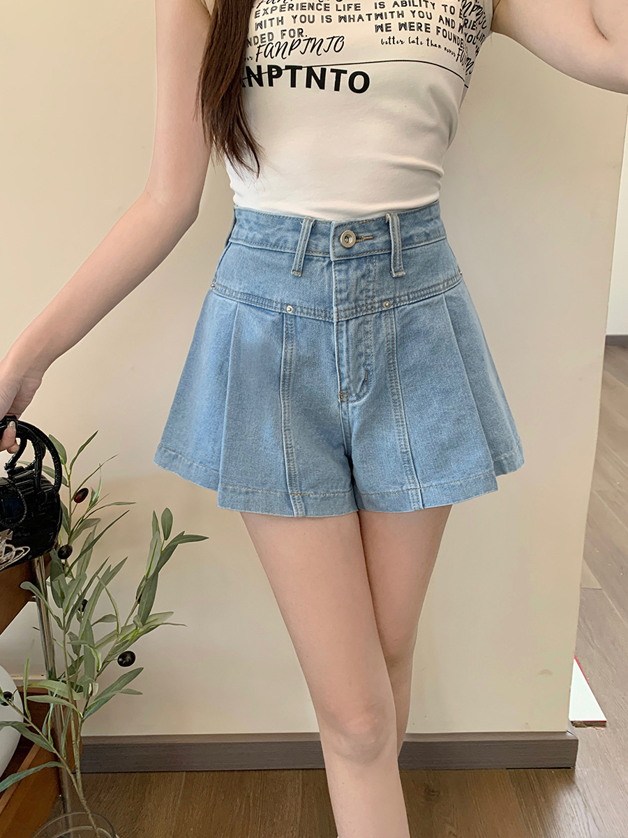 实拍牛仔短裤女年夏季新款高腰宽松显瘦百搭阔腿荷叶边百褶裤
