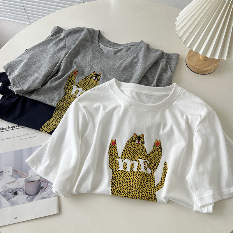 可爱卡通豹印花短袖T恤女夏季新款基础宽松圆领休闲上衣百搭打底