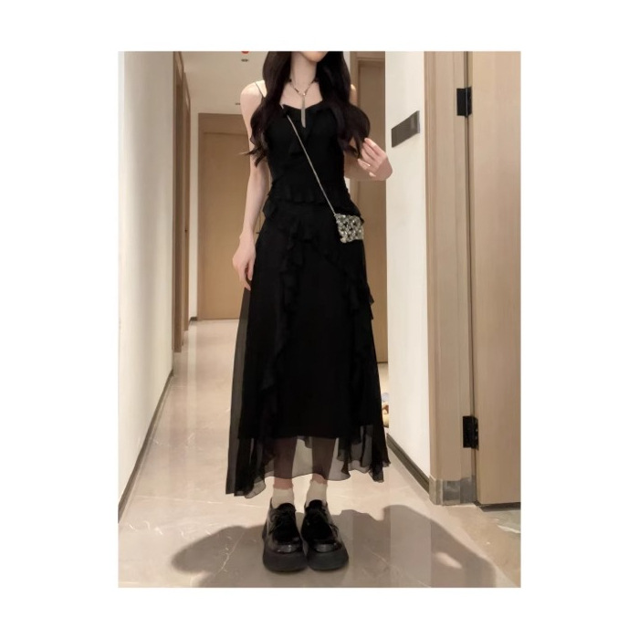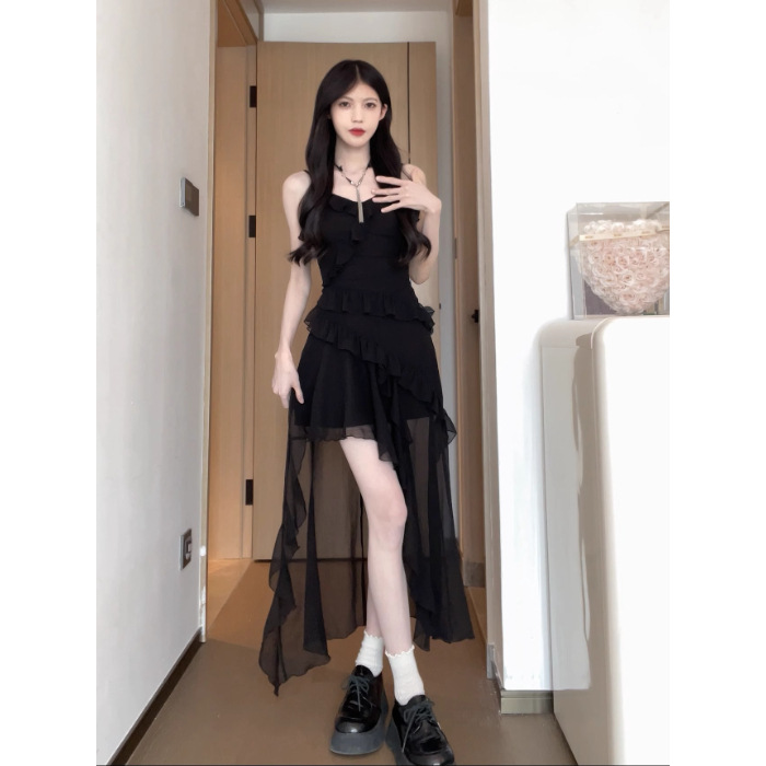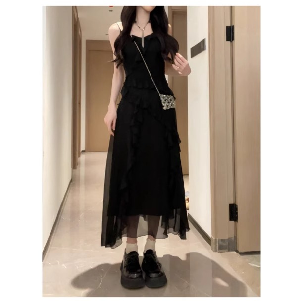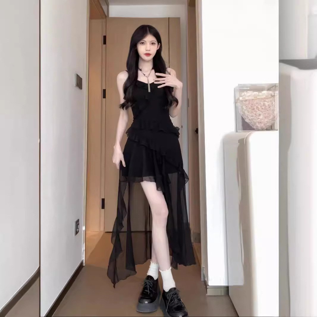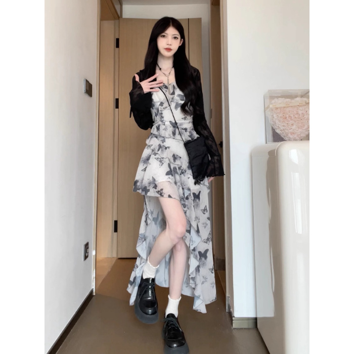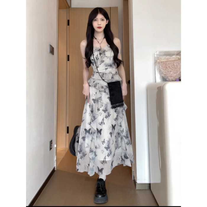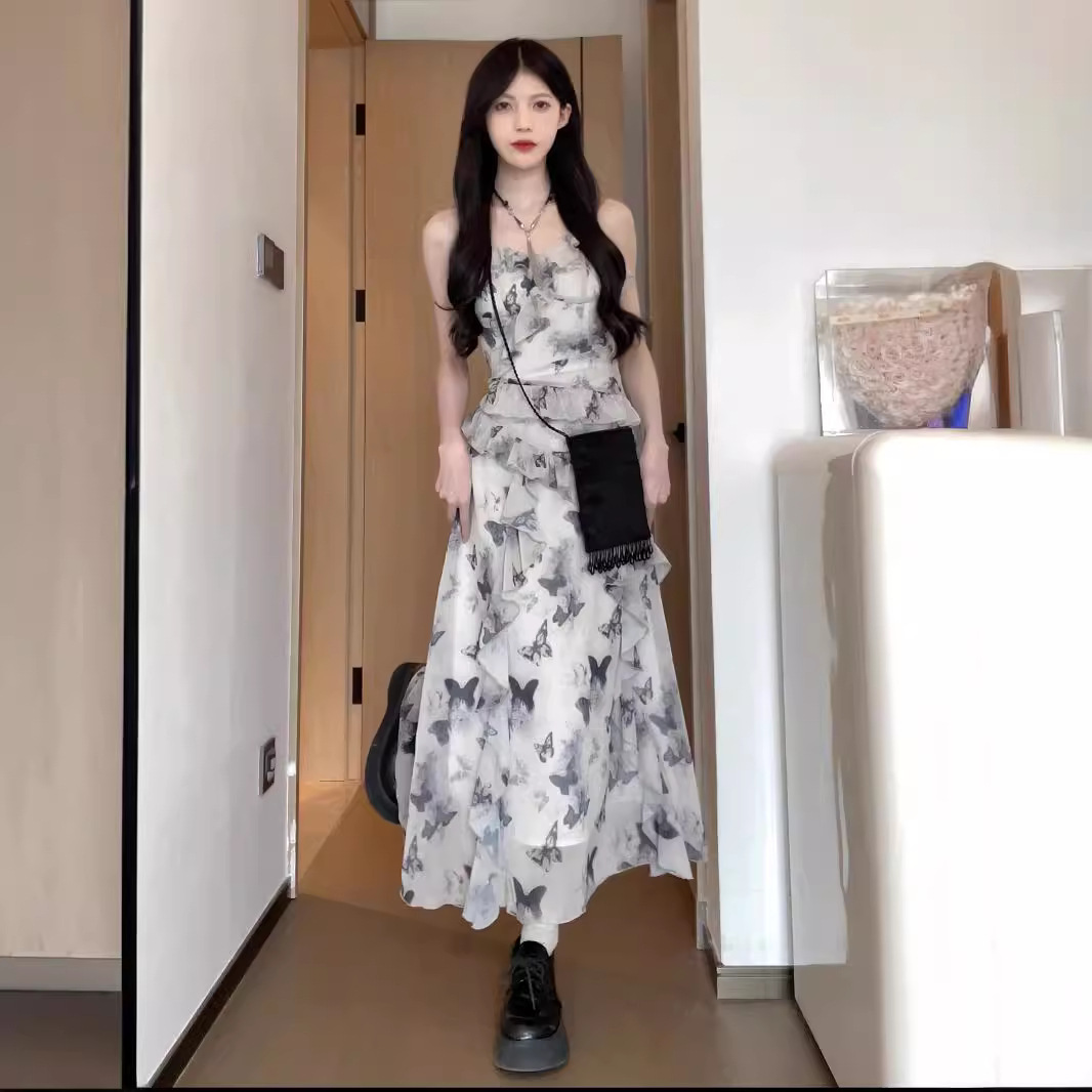 小众设计感碎花蝴蝶不规则吊带裙女春夏秋微胖显瘦长裙洋气连衣裙