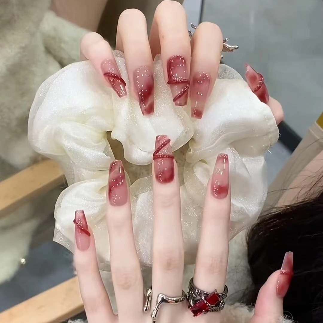 纯手工美甲穿戴甲假指甲贴片千禧辣妹红色晕染丝带纯欲古韵新中式