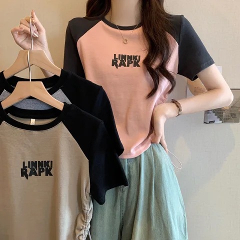 短袖t恤少女童夏装新款初中高中学生美式拼接撞色字母上衣服