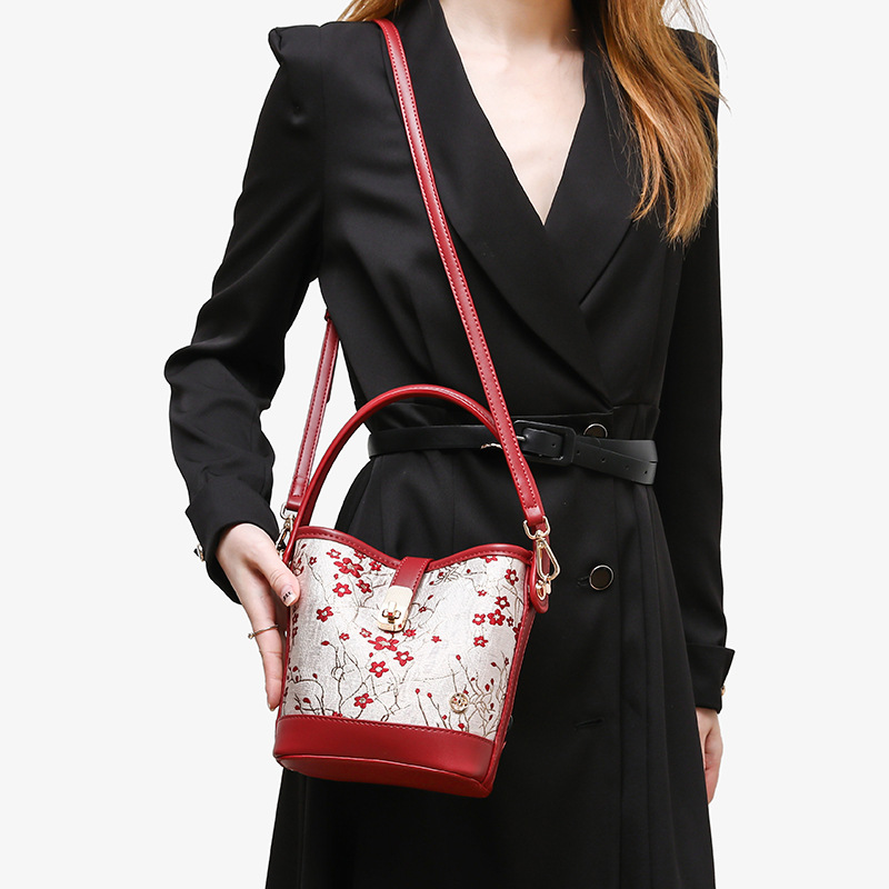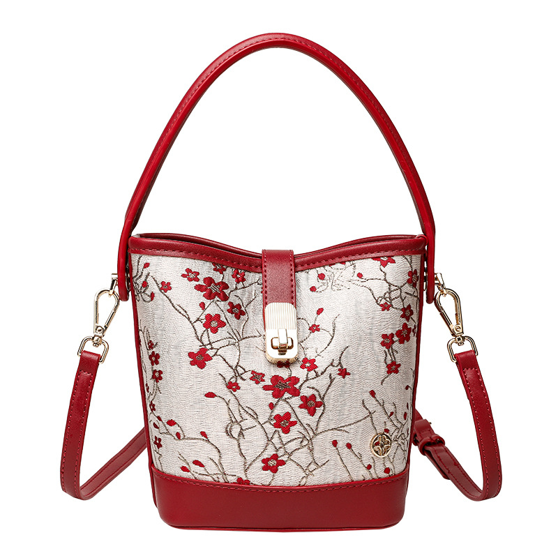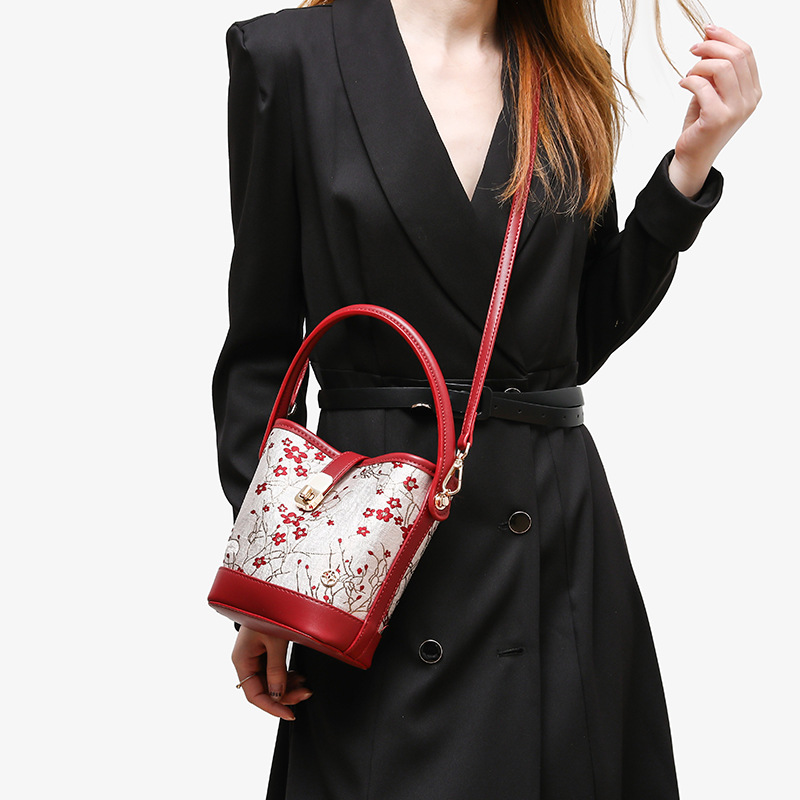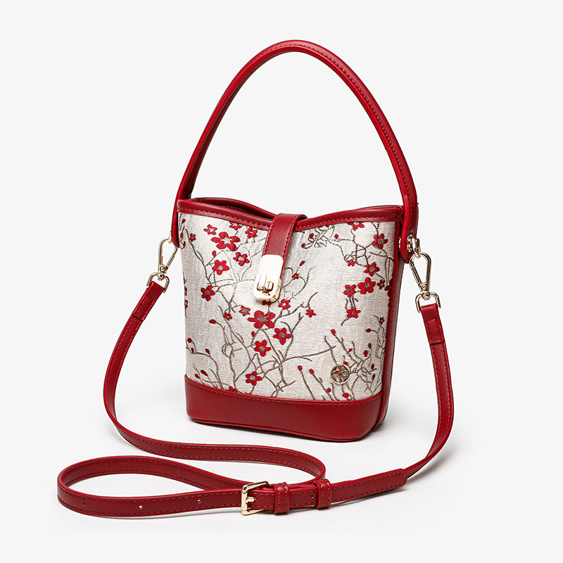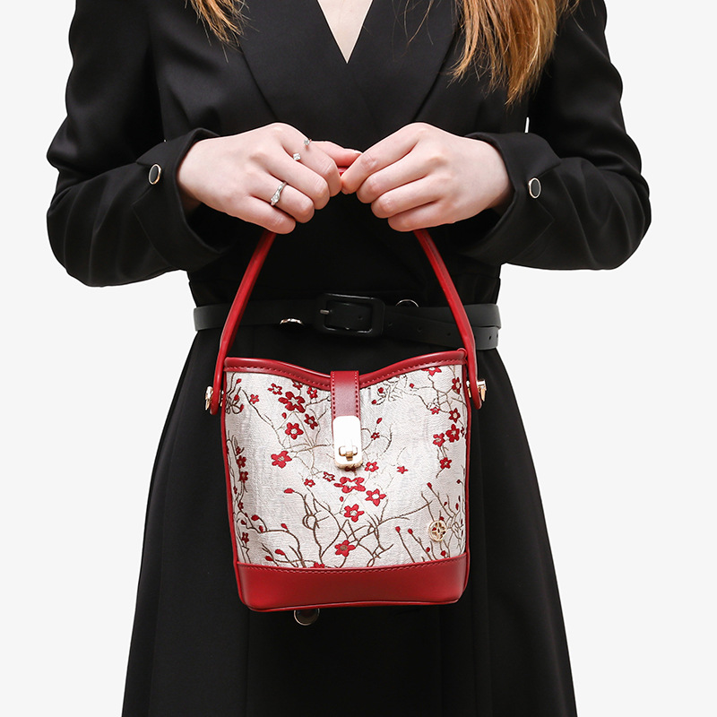 夏季新款小众手提包国风新中式梅花刺绣大容量单肩斜挎水桶包