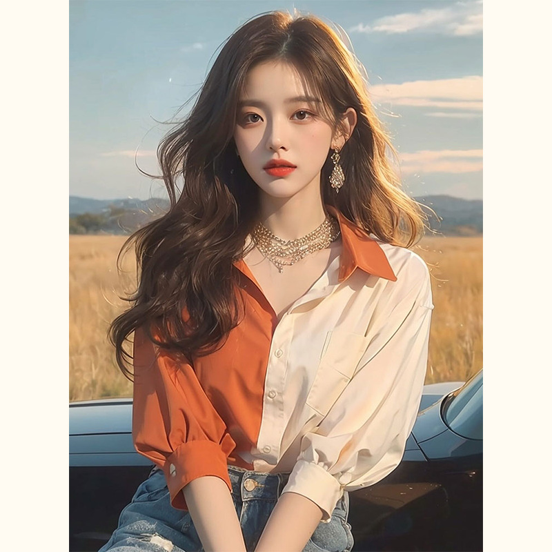 夏季气质上衣女新款高级感洋气高端别致小衫橙色拼色防晒衬衫