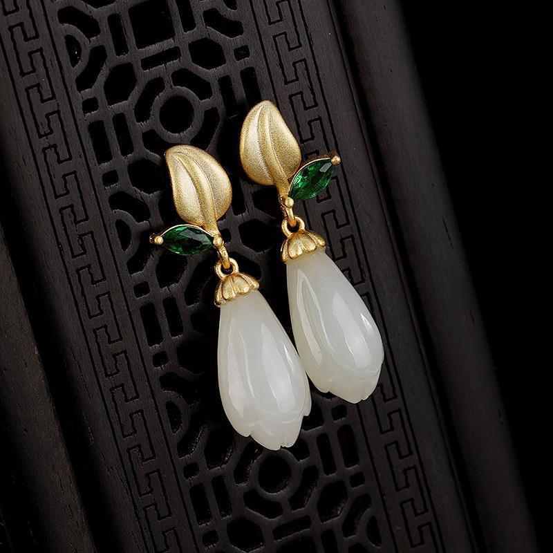 s925银镀金镶嵌天然和田玉白玉配碧玉玉兰花耳坠女款自然简约耳饰