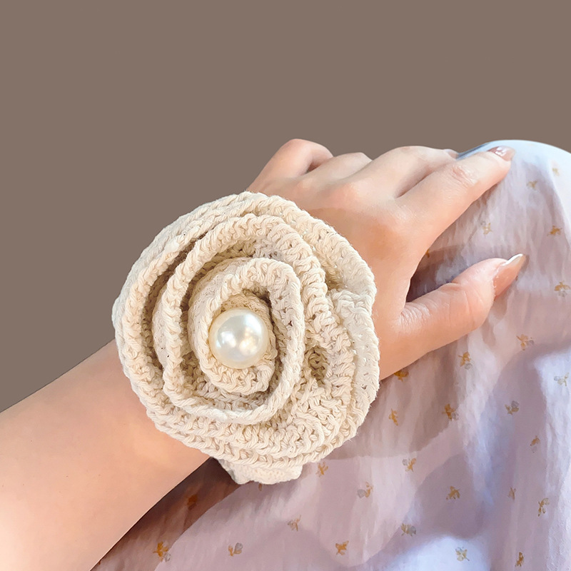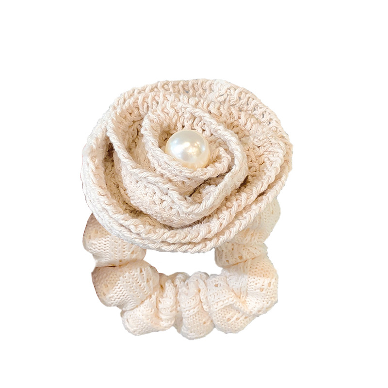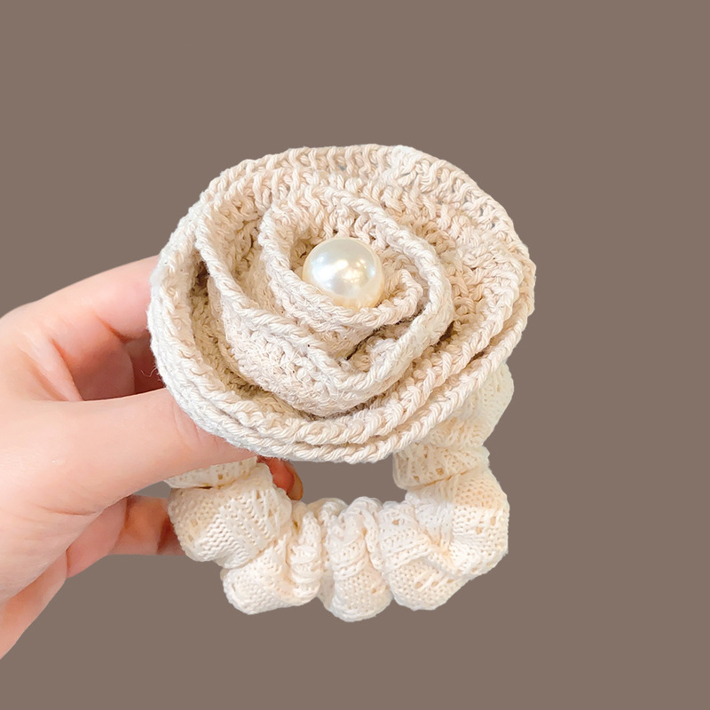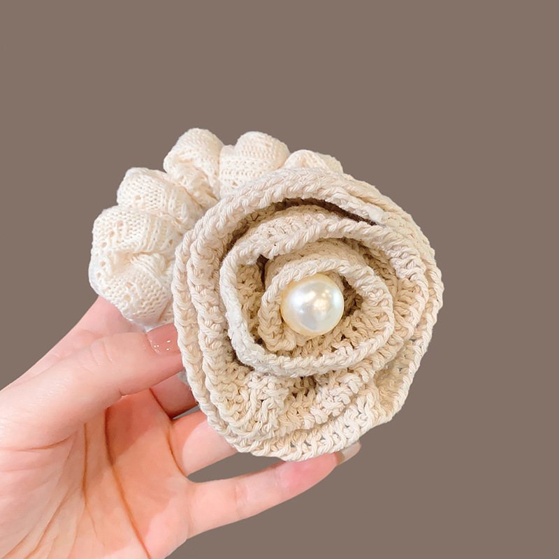 韩版高级感褶皱立体针织玫瑰花朵珍珠肥肠圈夏季新款发圈马尾发绳