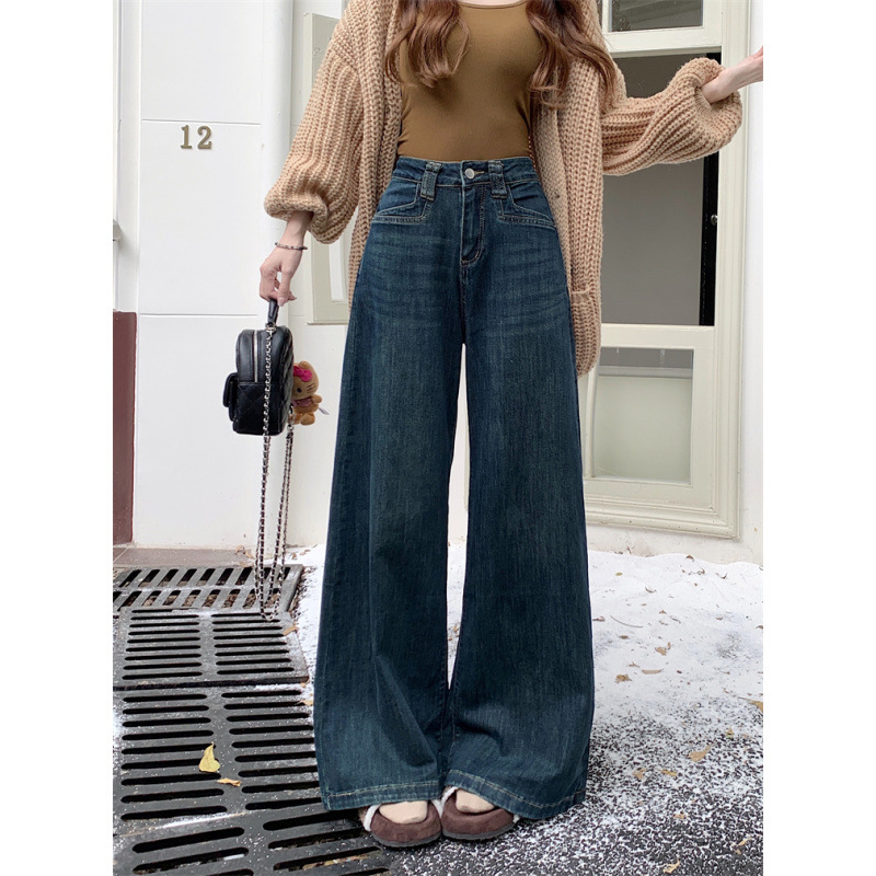 复古水洗阔腿牛仔裤女高腰显瘦宽松微喇拖地直筒长裤