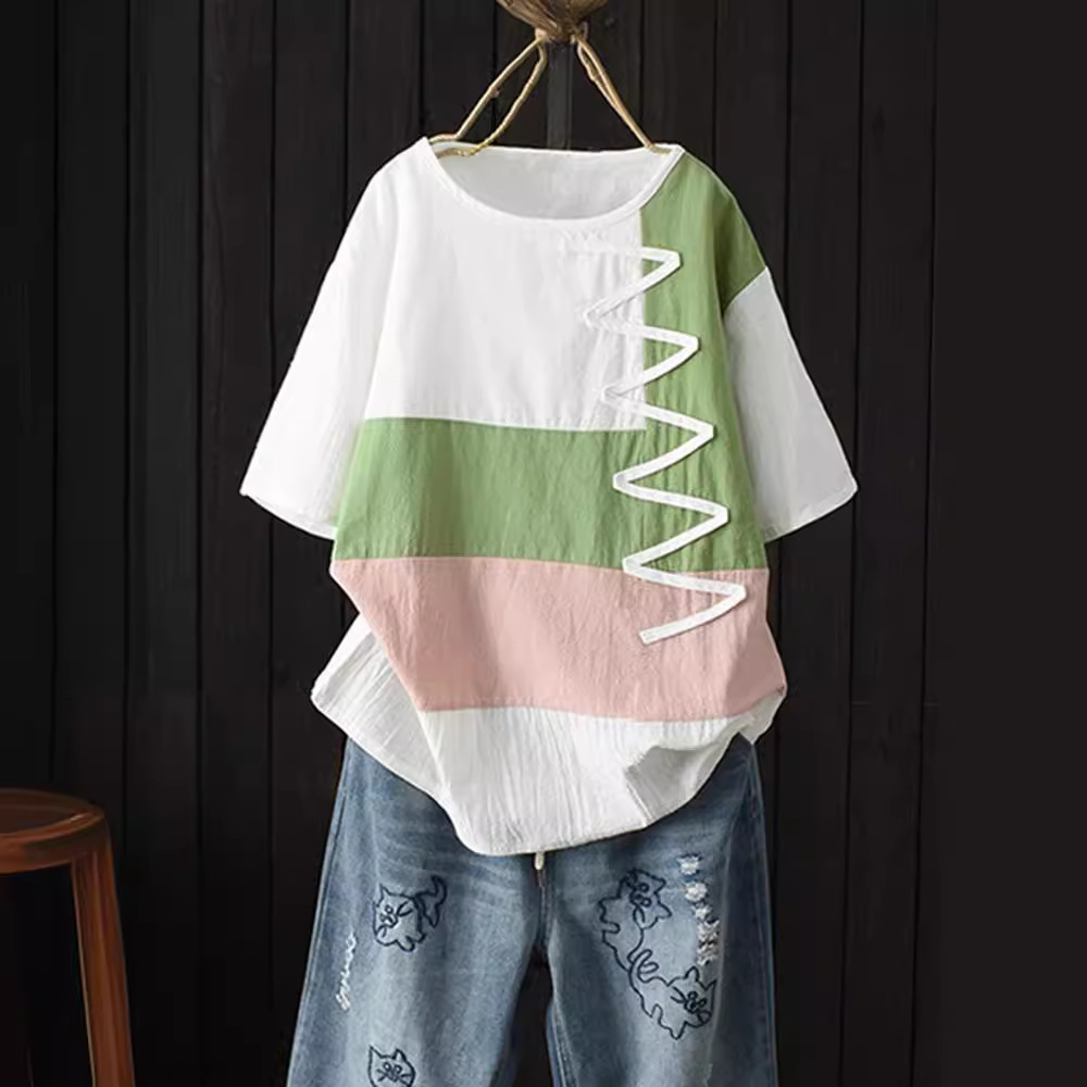 夏季新款大码女装圆领宽松短袖拼色T恤上衣女