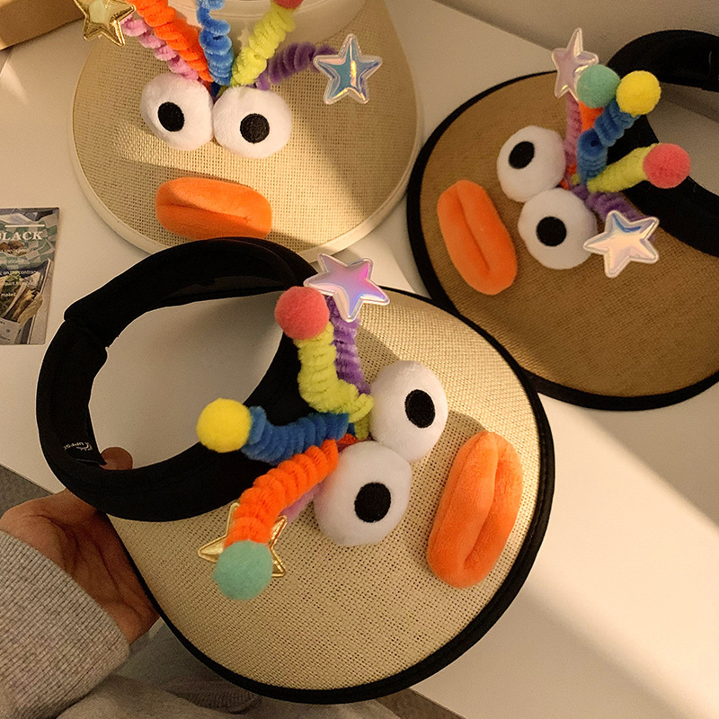 可爱丑萌帽子女夏季防晒帽新款学生空顶遮阳帽草编黑胶太阳帽