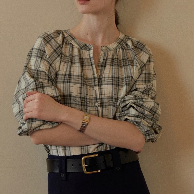 黑白格纹衬衫宽松圆领廓形衬衫女夏季气质新款百搭上衣