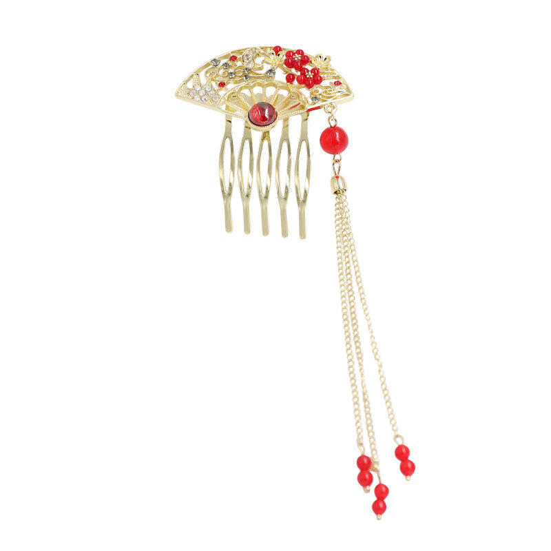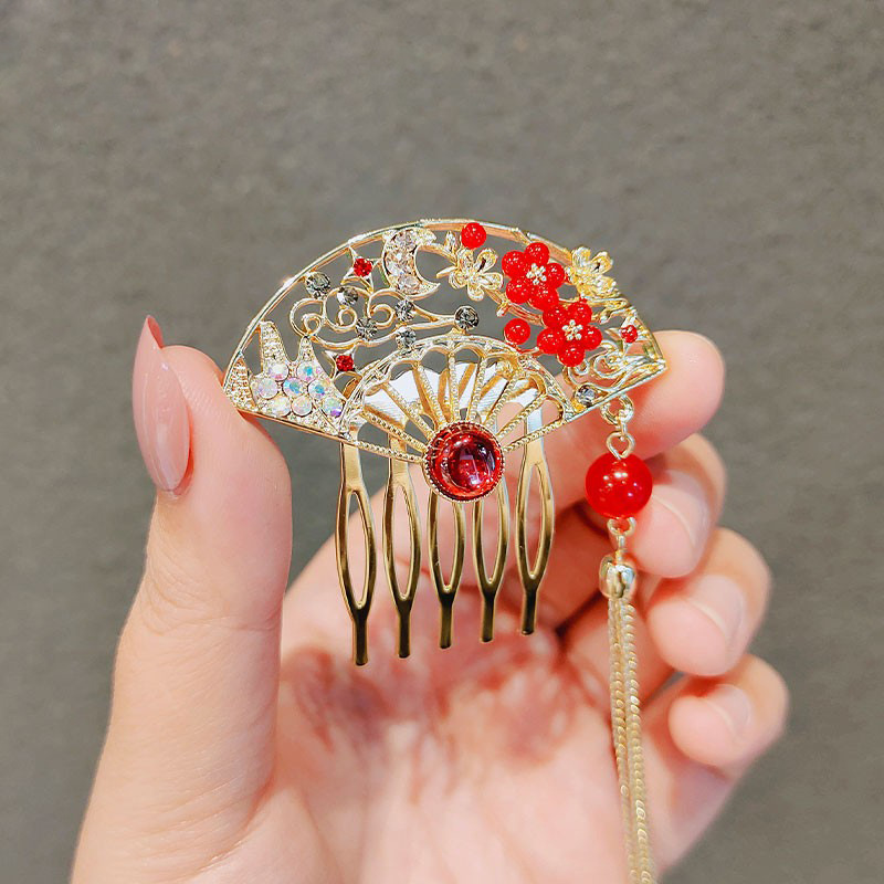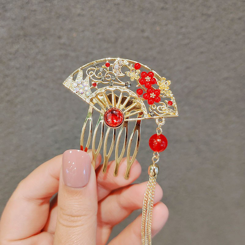 国风扇子步摇发簪头饰汉服流苏古风发梳喜庆插梳刘海发卡盘发头饰