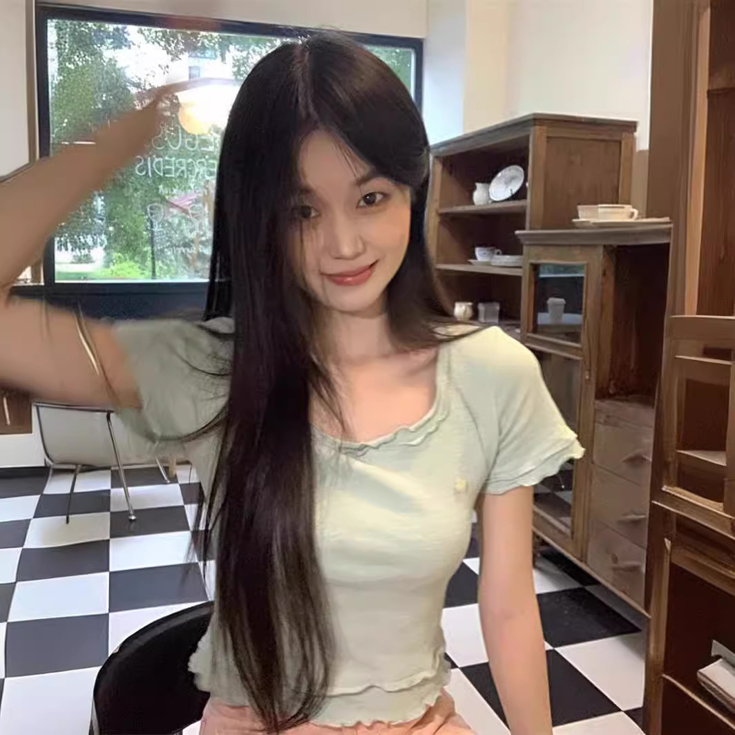 木耳边甜美薄荷曼波短袖T恤女夏季新款收腰显瘦短款套头上衣
