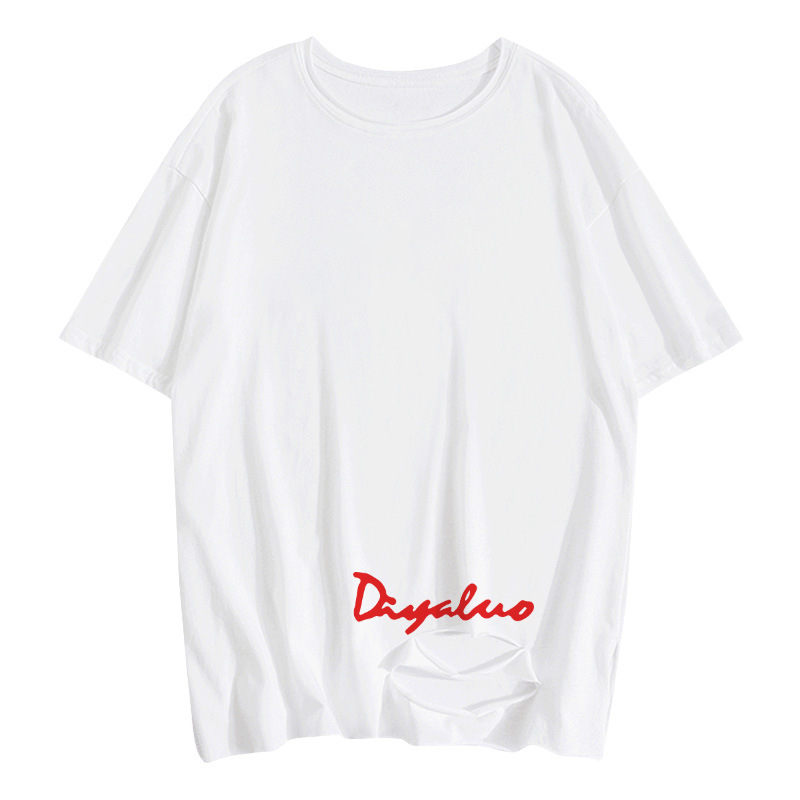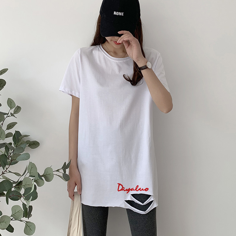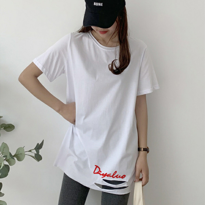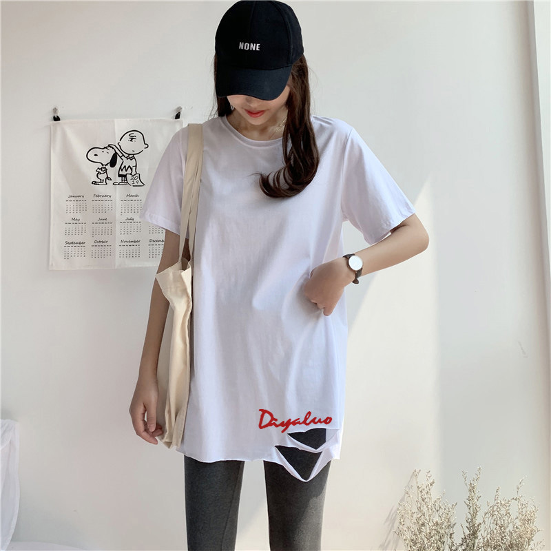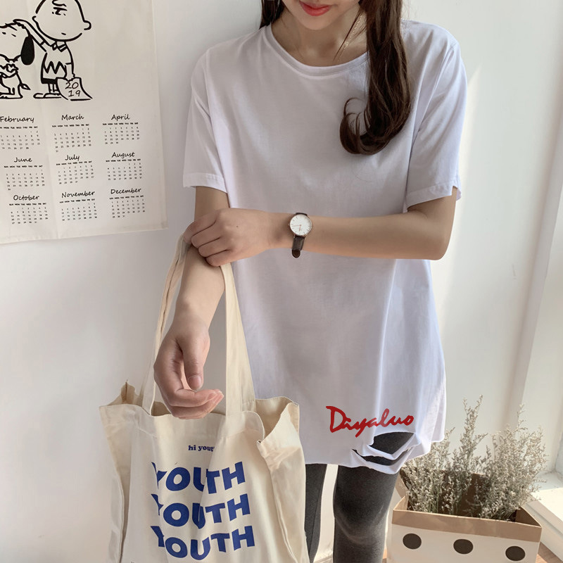 中长款纯棉短袖t恤女新款下摆破洞开叉字母印花宽松半袖上衣