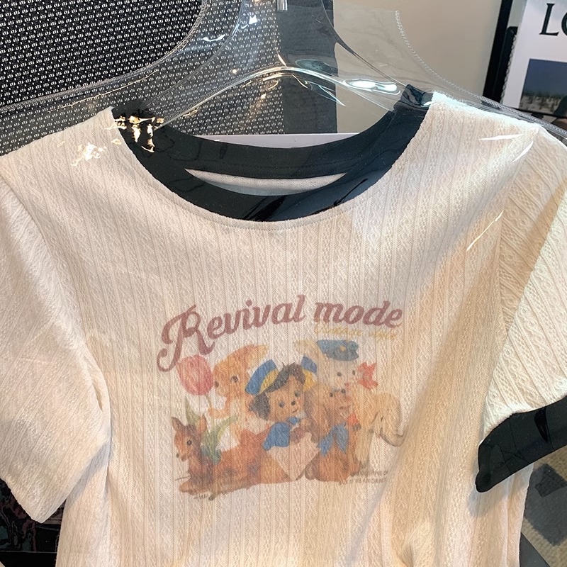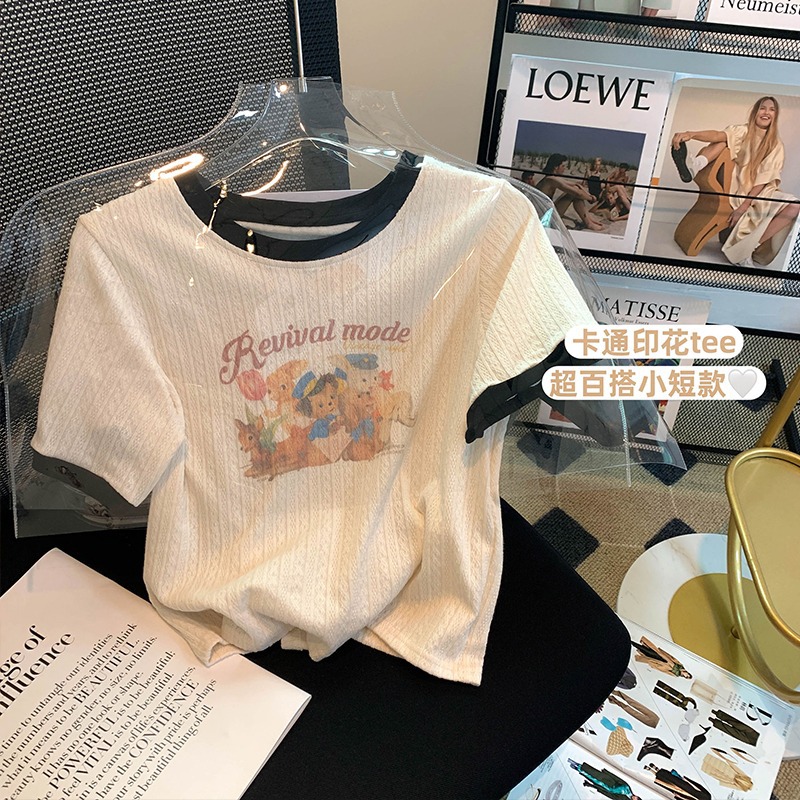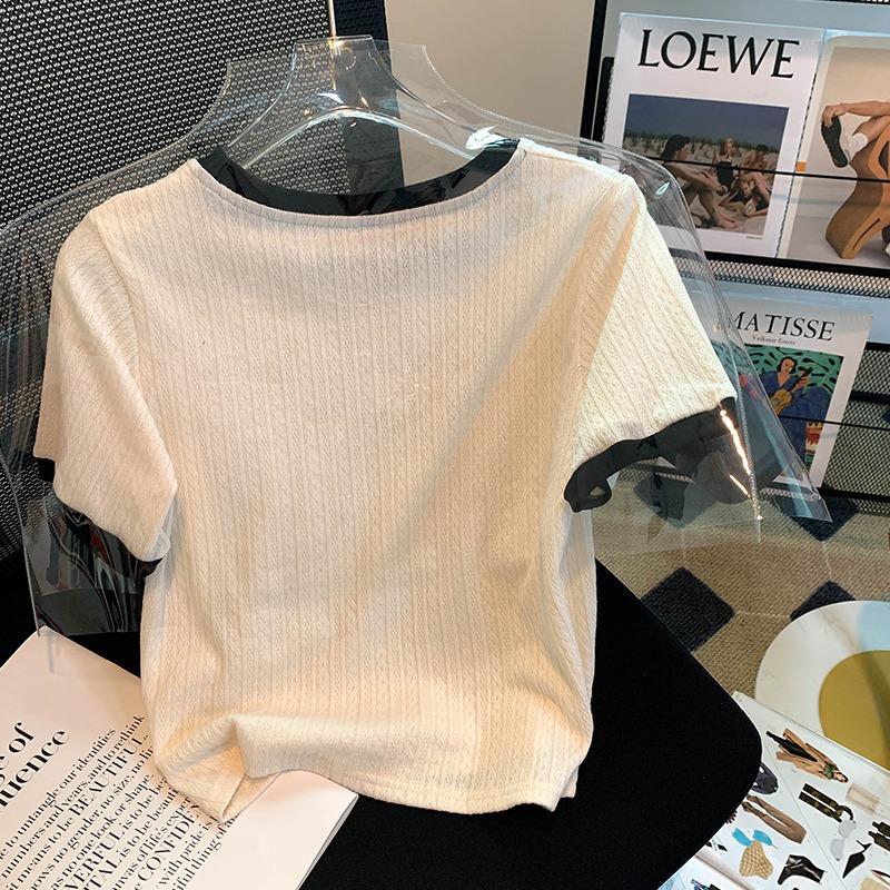 夏季设计感撞色短款正肩短袖T恤女宽松高腰美式复古体桖上衣ins潮