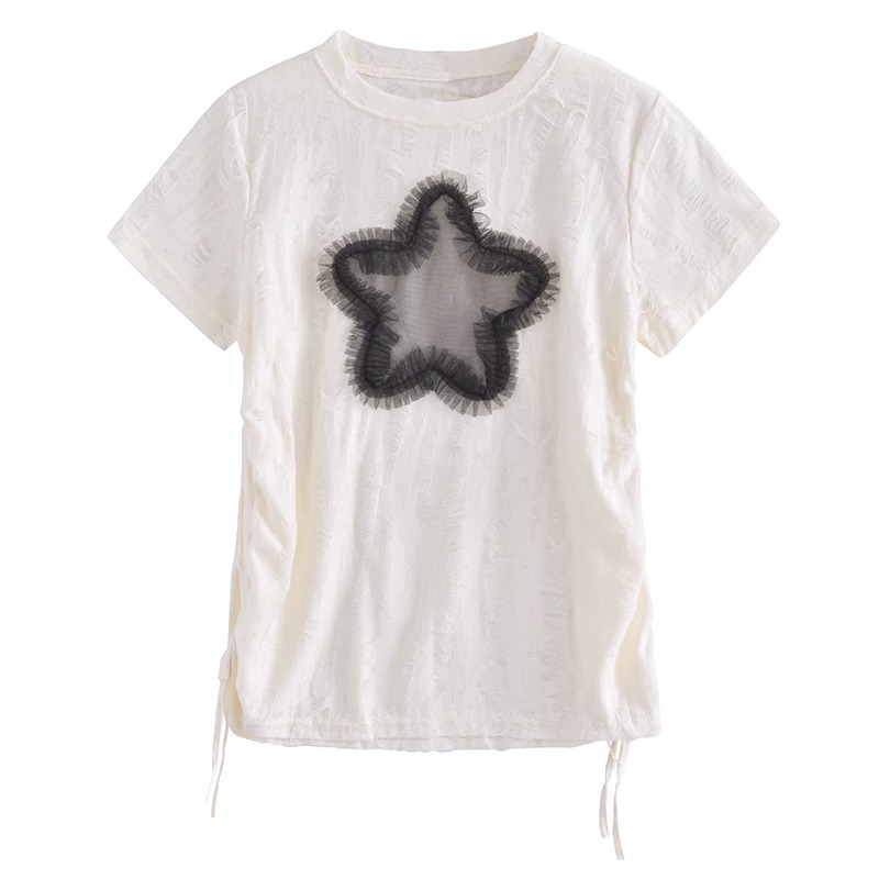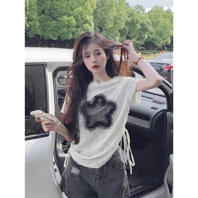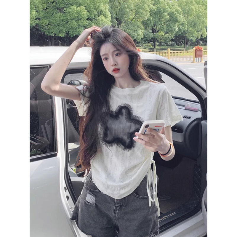 抽绳星星正肩短袖t恤女夏季新款设计感美式辣妹收腰显瘦上衣